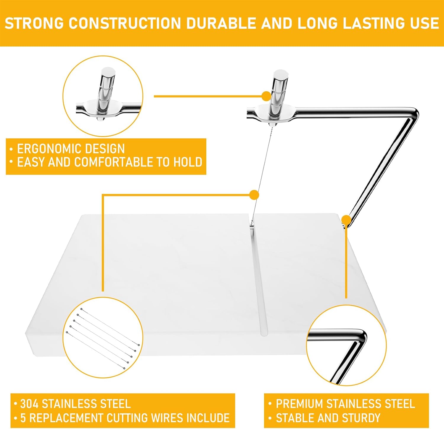 • Универсален кухненски инструмент: Нарежете без усилие различни сирена и дори деликатен ръчно изработен сапун с нашата издръжлива, безопасна за храна тел за рязане на сирене от неръждаема стомана. Лесният за почистване дизайн гарантира безупречни резултати всеки път. Идеален за употреба с моцарела, швейцарско сирене, пармезан, масло и други.