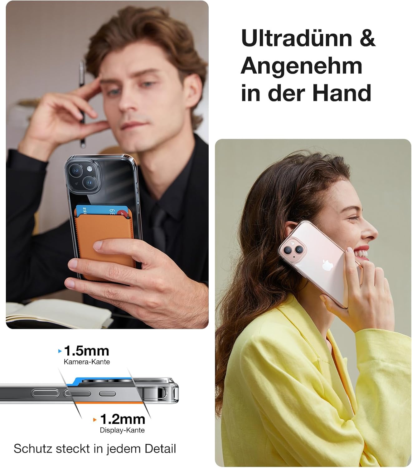• [Тънък калъф = слаба защита? Не!] Технологията непрекъснато се развива. Точно както ултралекото пухено яке ви държи топло, ултратънкият джоб също предлага същата защита. Благодарение на използването на гъвкави термопластични смолни материали и специална технология за формоване, калъфът е подобен на въглеродните влакна: по-лек, но по-здрав. Предната и задната част са защитени, ръбовете на екрана на камерата и миниатюрните въздушни възглавници на 360° за всестранна защита.