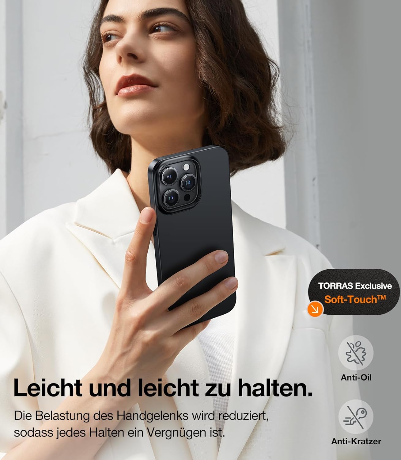 TORRAS 2025 Ултратънък калъф за мобилен телефон за iPhone 15 Pro Max, всестранна защита, отлично кадифено захващане като оригинала, защитен, тънък, черен