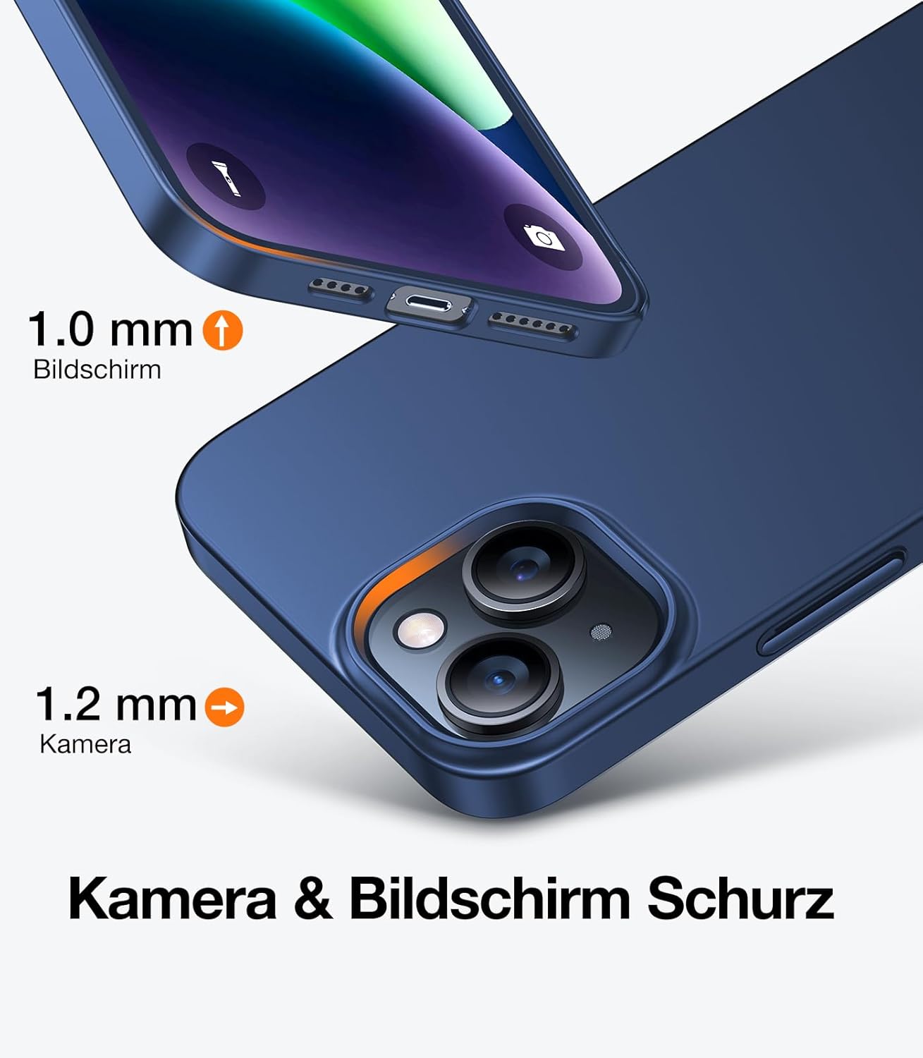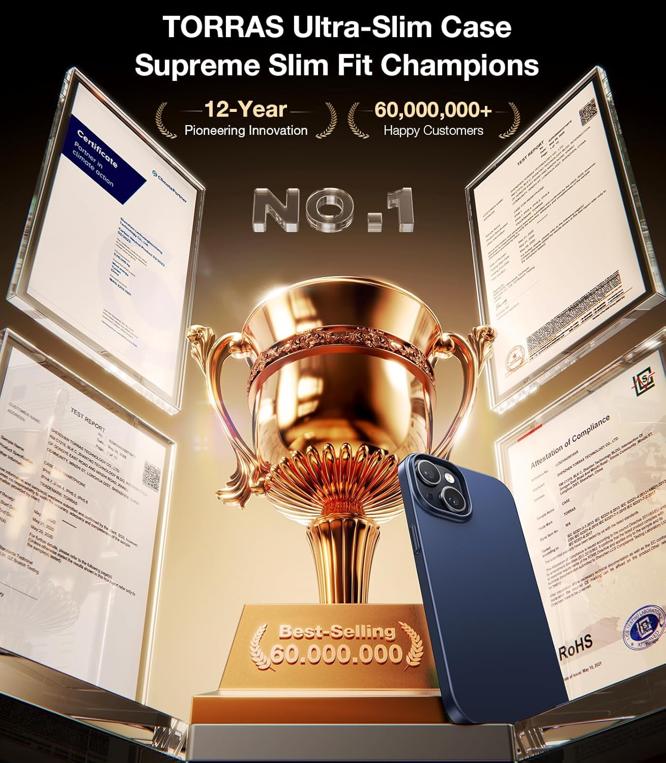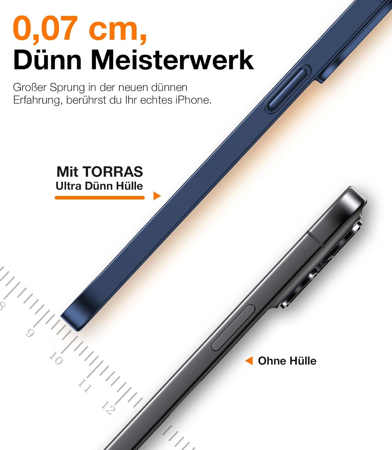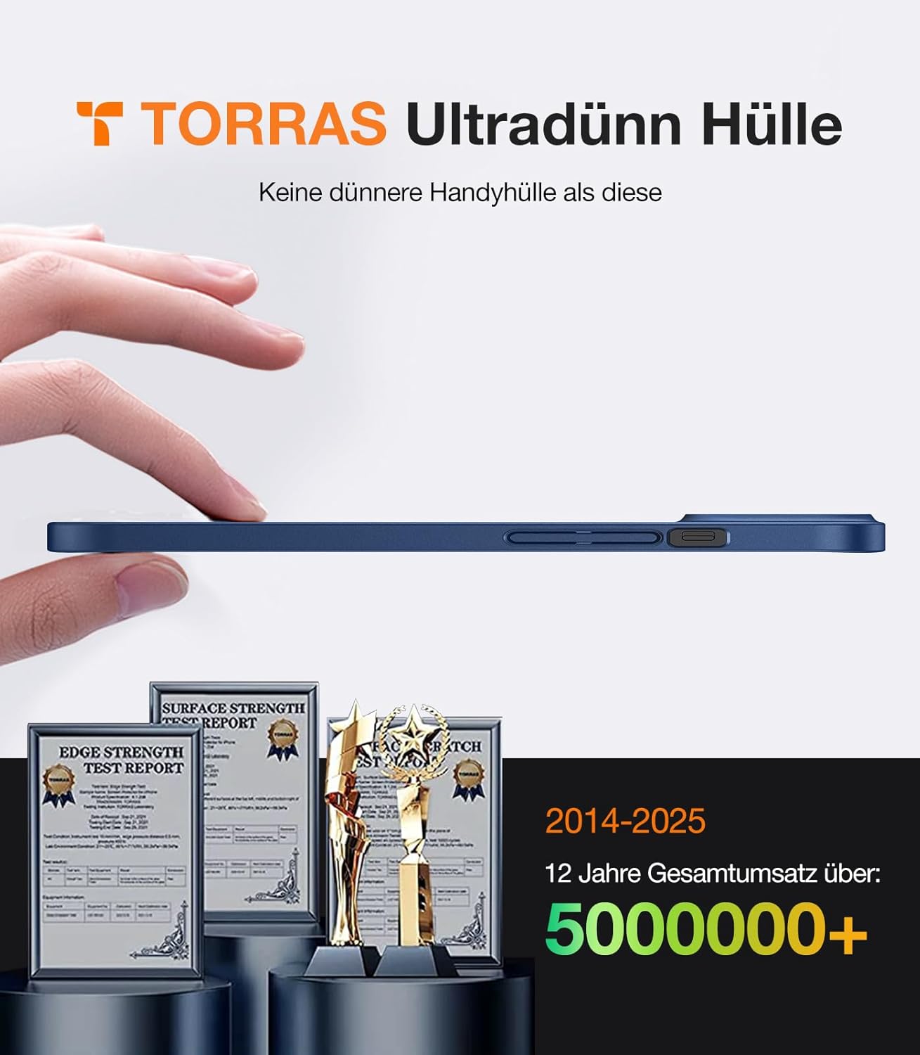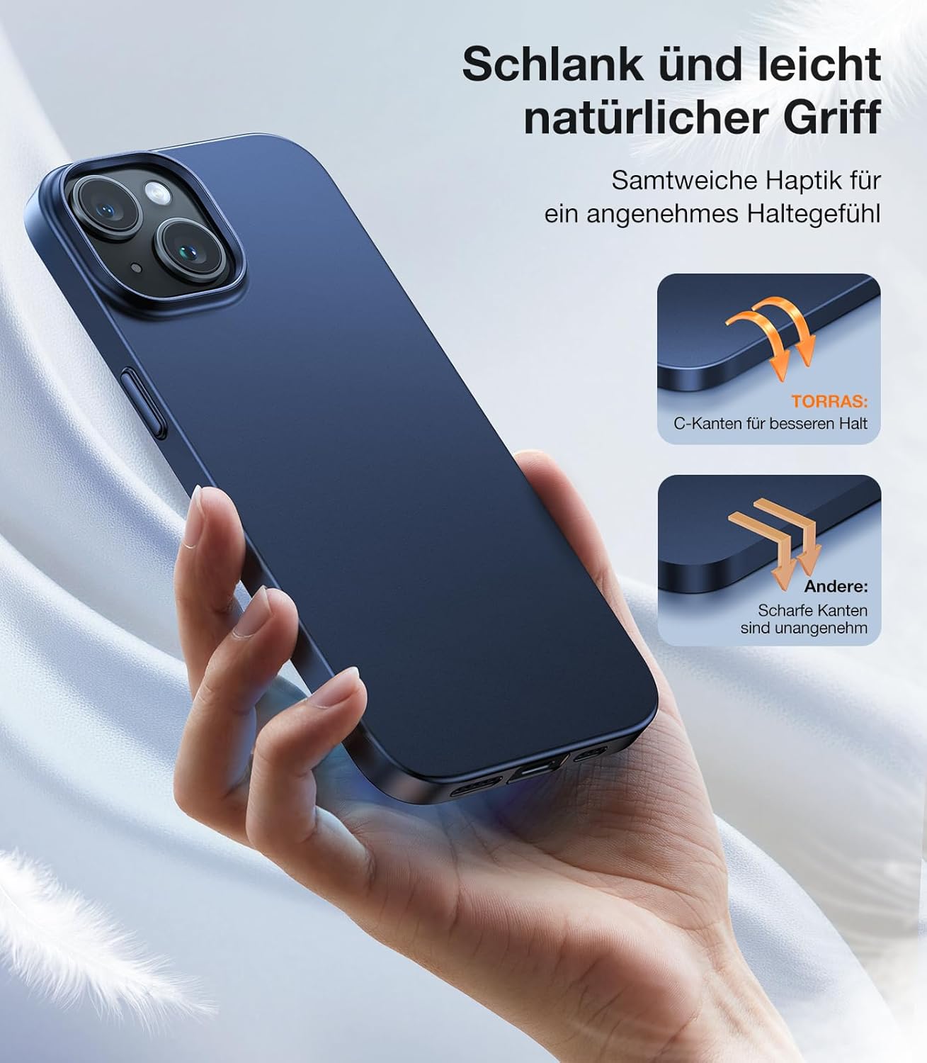 TORRAS 2025 Ултратънък калъф за мобилен телефон за iPhone 15, всестранна защита, отлично кадифено захващане като оригинала, защитен, тънък, син