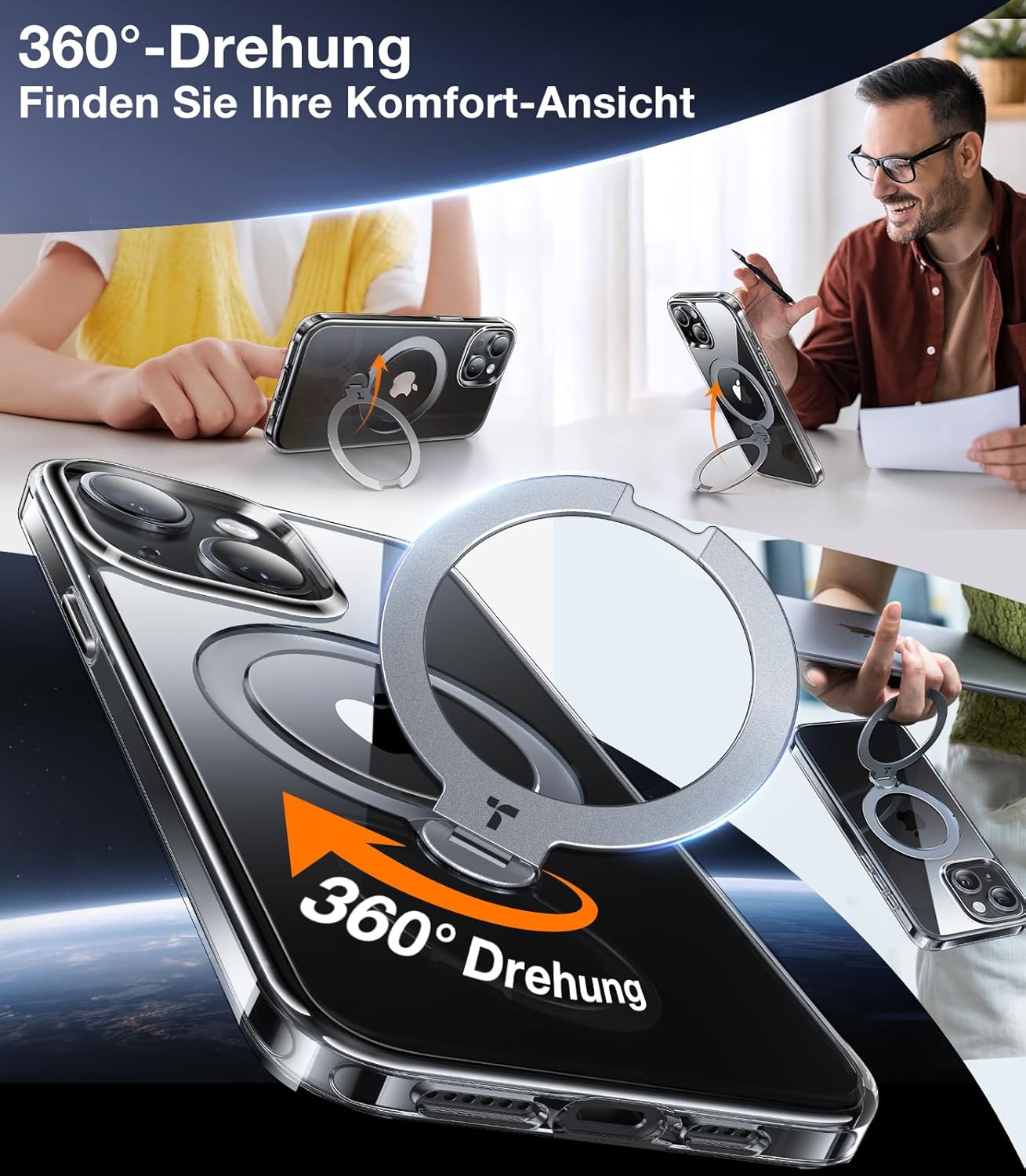 • [360-градусов пръстен за стойка: Стабилизиран за всеки желан ъгъл: Завъртането осигурява 360° завъртане и четириточково позициониране за най-стабилен ъгъл. С максимална гъвкавост можете да регулирате хоризонтално изгледа от 15° до 160° и вертикално от 30° до 90°. Независимо дали гледате видеоконференции или провеждате дълги телефонни разговори, калъфът за iPhone 17 Pro може лесно да се регулира до желания ъгъл и по този начин осигурява максимален комфорт в свободното време и по-голяма ефективност на работното място.]