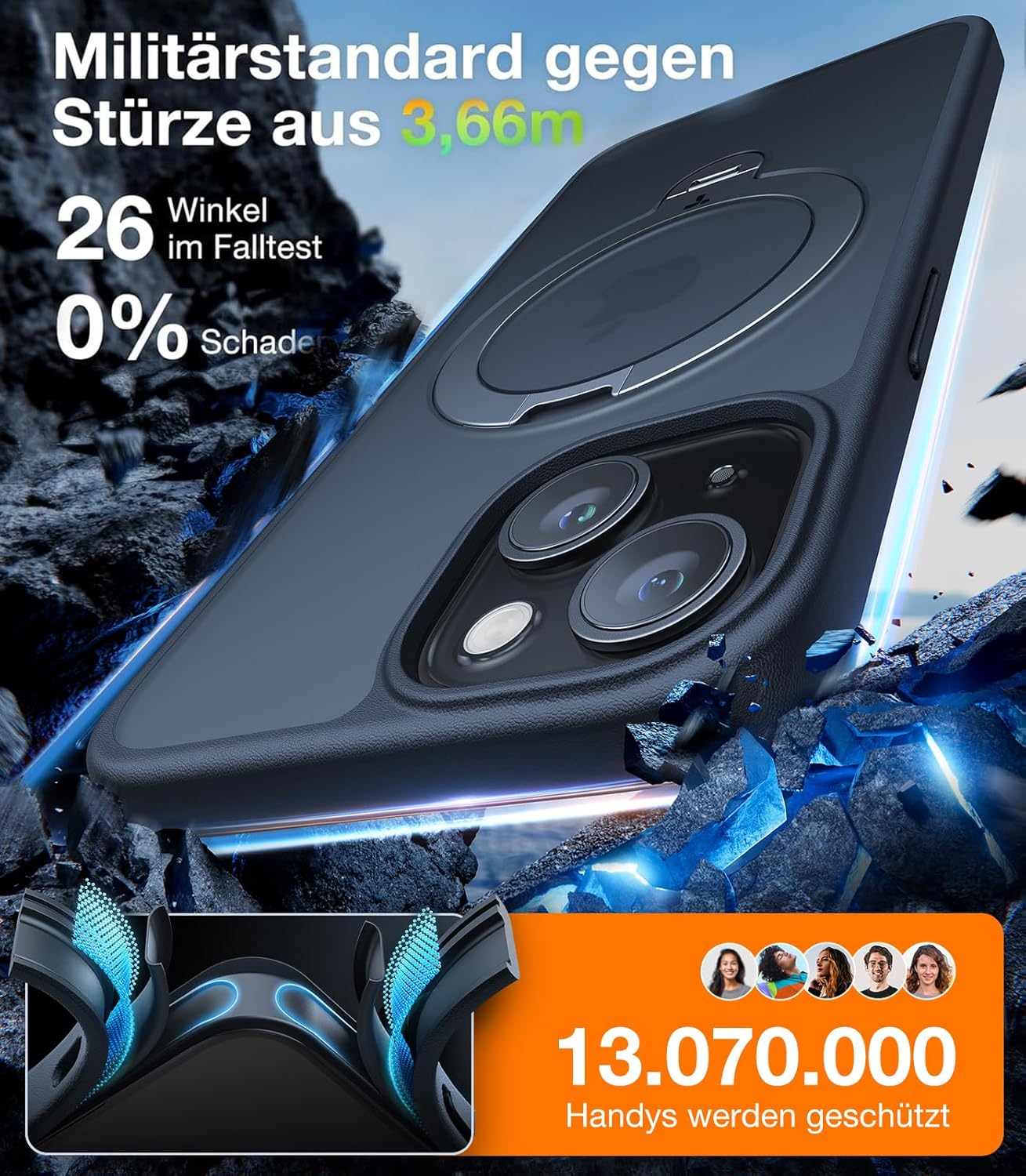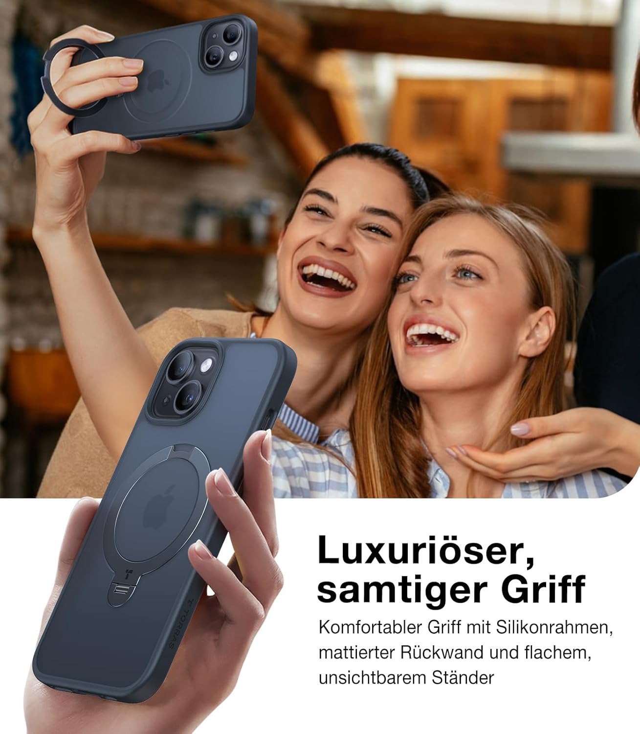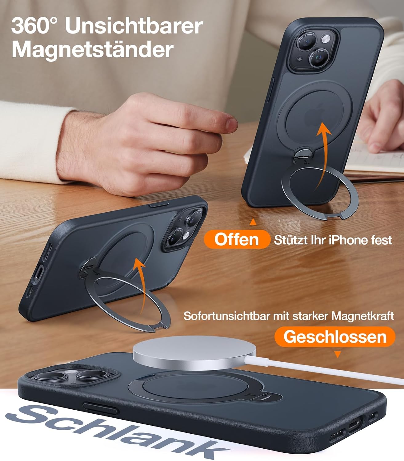 • [360-градусов пръстен за стойка: Стабилизиран за всеки желан ъгъл: Завъртането осигурява 360° завъртане и четириточково позициониране за най-стабилен ъгъл. С максимална гъвкавост можете да регулирате хоризонтално изгледа от 15° до 160° и вертикално от 30° до 90°. Независимо дали гледате видеоконференции или провеждате дълги телефонни разговори, калъфът за iPhone 17 Pro може лесно да се регулира до желания ъгъл и по този начин осигурява максимален комфорт в свободното време и по-голяма ефективност на работното място.]