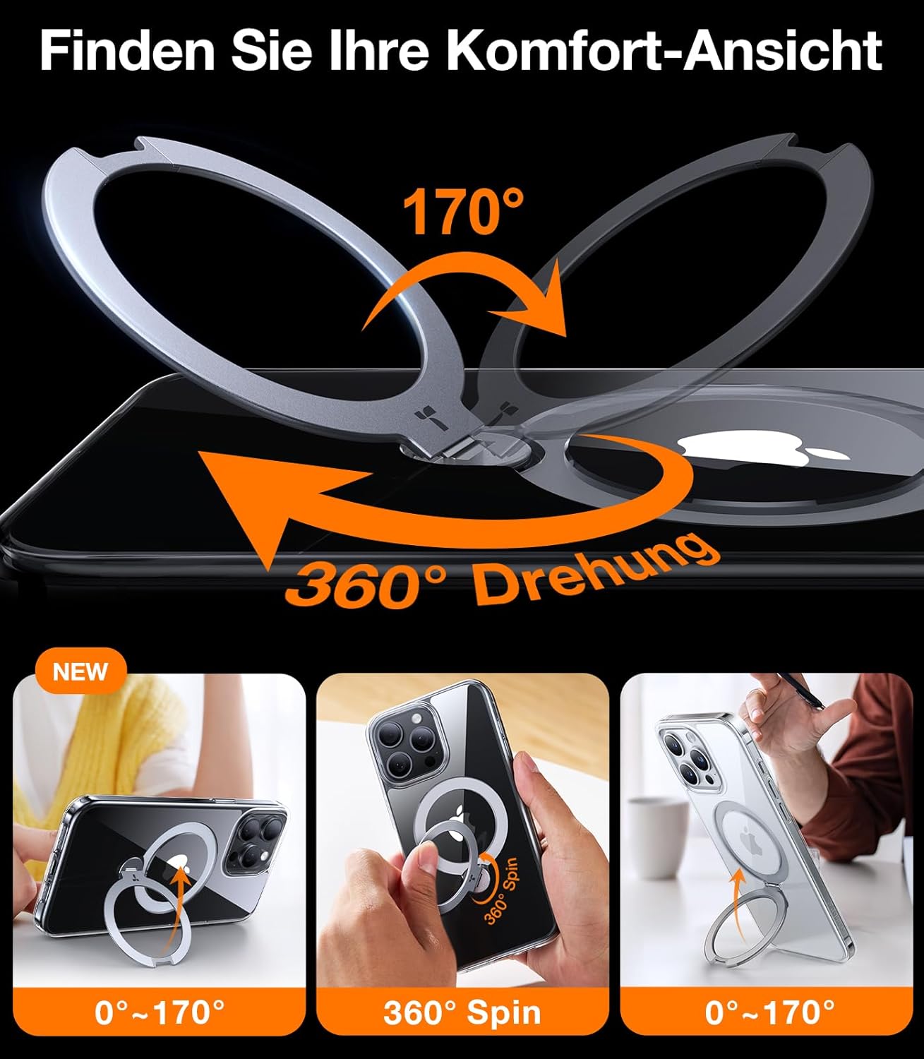 • [360-градусов пръстен за стойка: Стабилизиран за всеки желан ъгъл: Завъртането осигурява 360° завъртане и четириточково позициониране за най-стабилен ъгъл. С максимална гъвкавост можете да регулирате хоризонтално изгледа от 15° до 160° и вертикално от 30° до 90°. Независимо дали гледате видеоконференции или провеждате дълги телефонни разговори, калъфът за iPhone 17 Pro може лесно да се регулира до желания ъгъл и по този начин осигурява максимален комфорт в свободното време и по-голяма ефективност на работното място.]