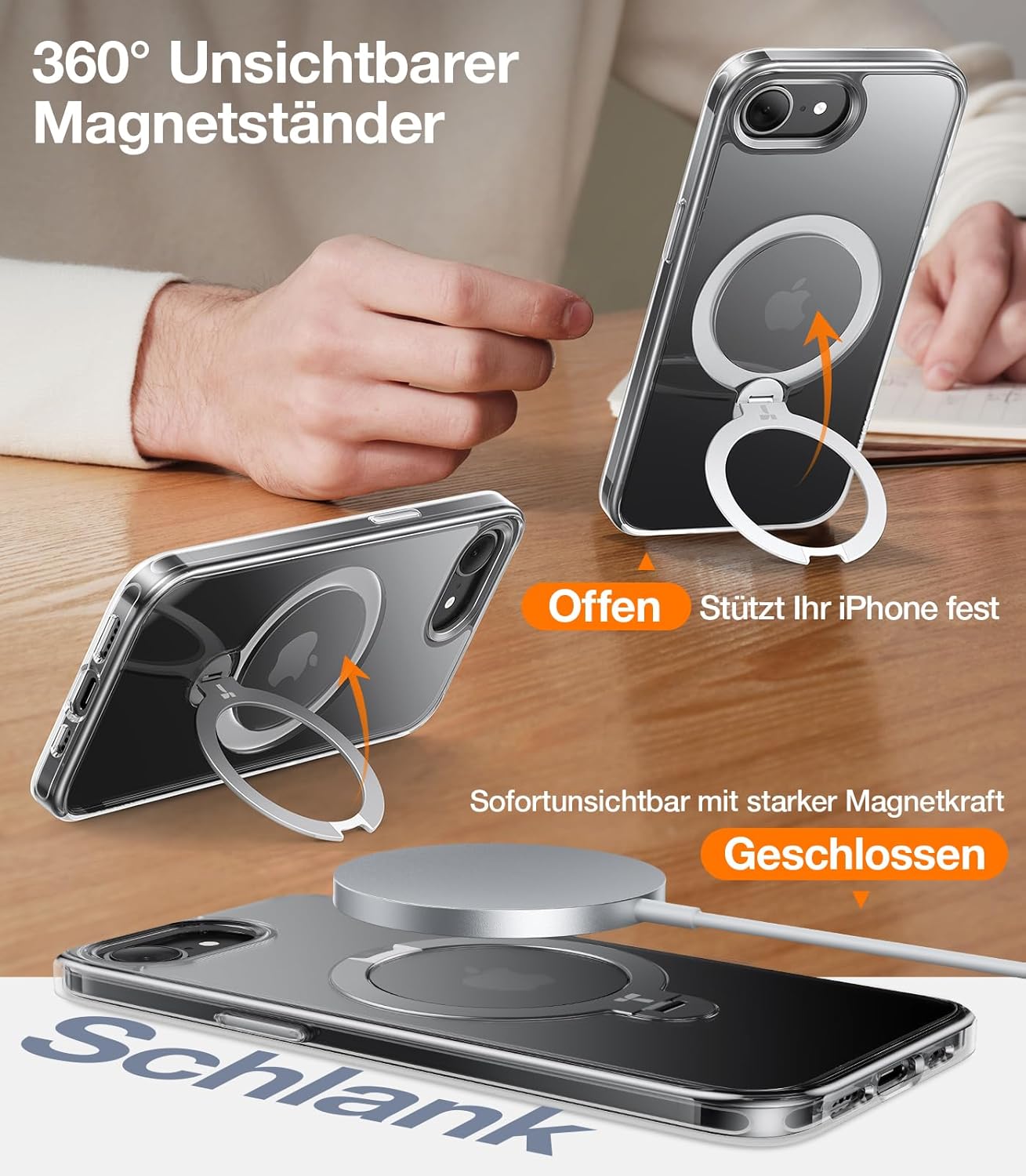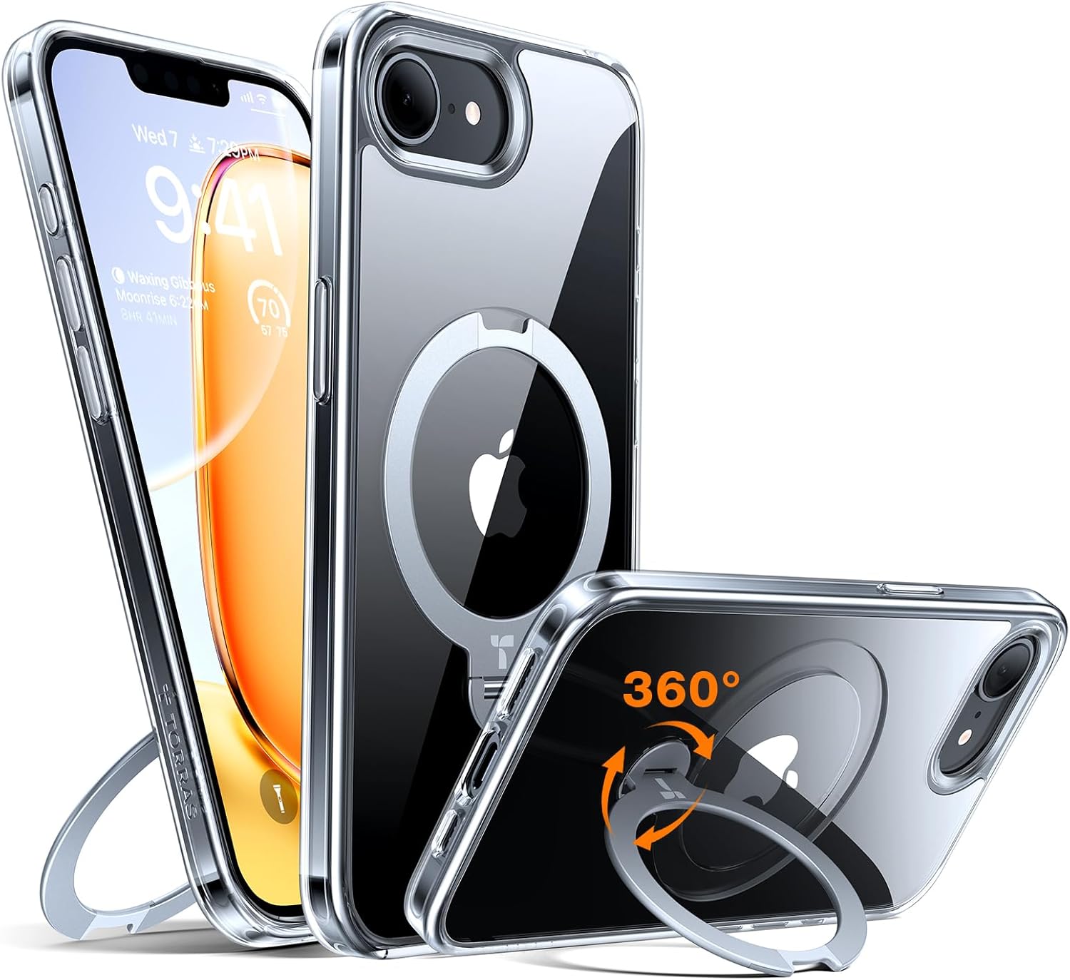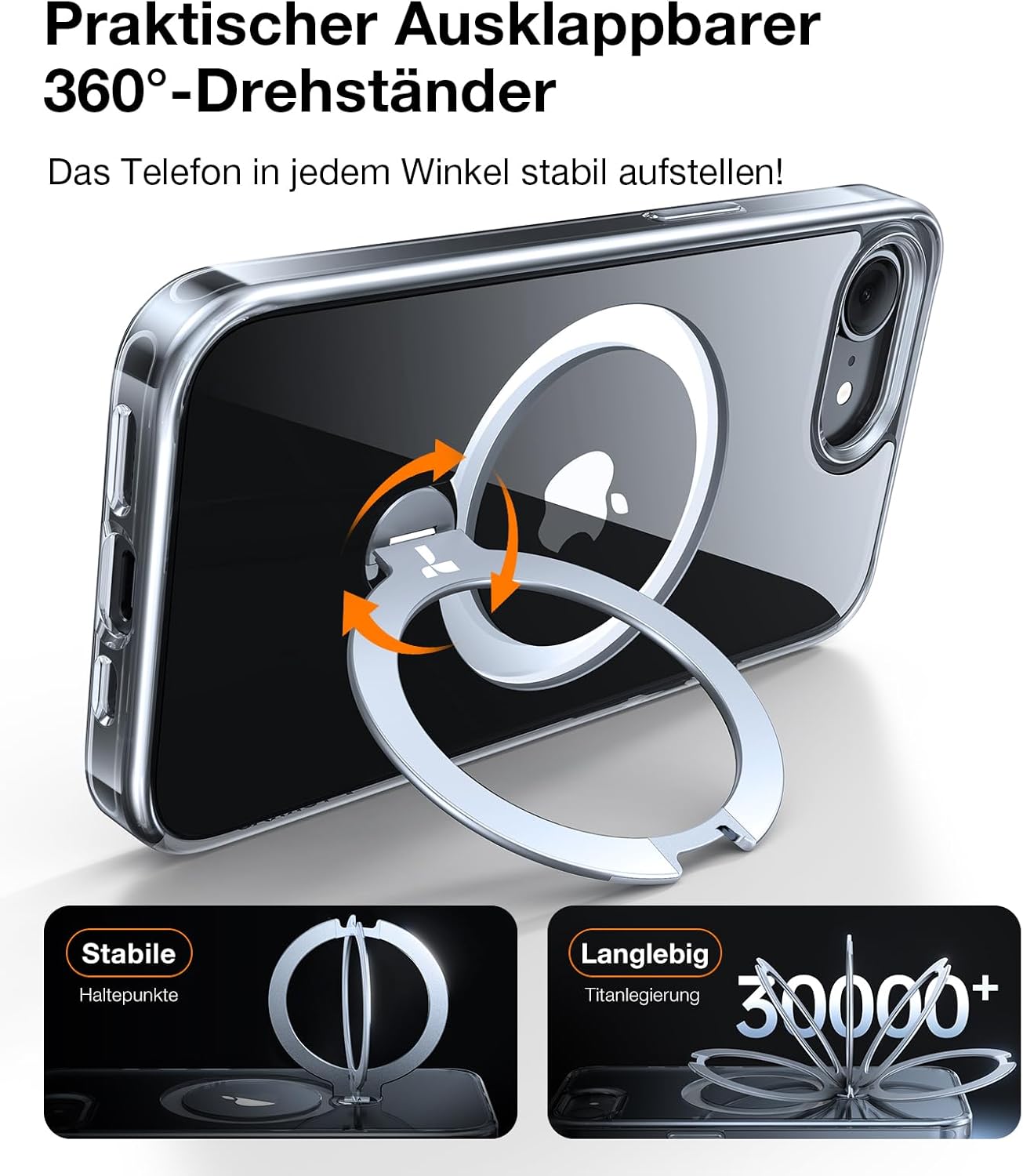 TORRAS 360° завъртащ се калъф за iPhone 16e с MagSafe (магнитен здрав пръстен за стойка), сертифициран военен защитен калъф за мобилен телефон, тънък калъф за iPhone 16e, прозрачен