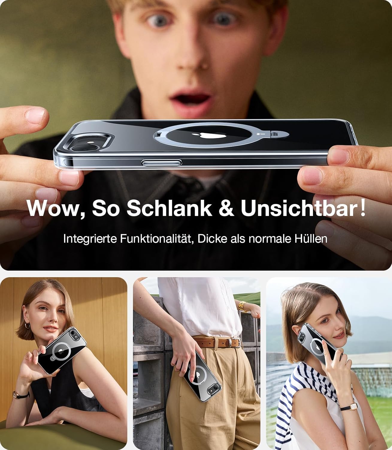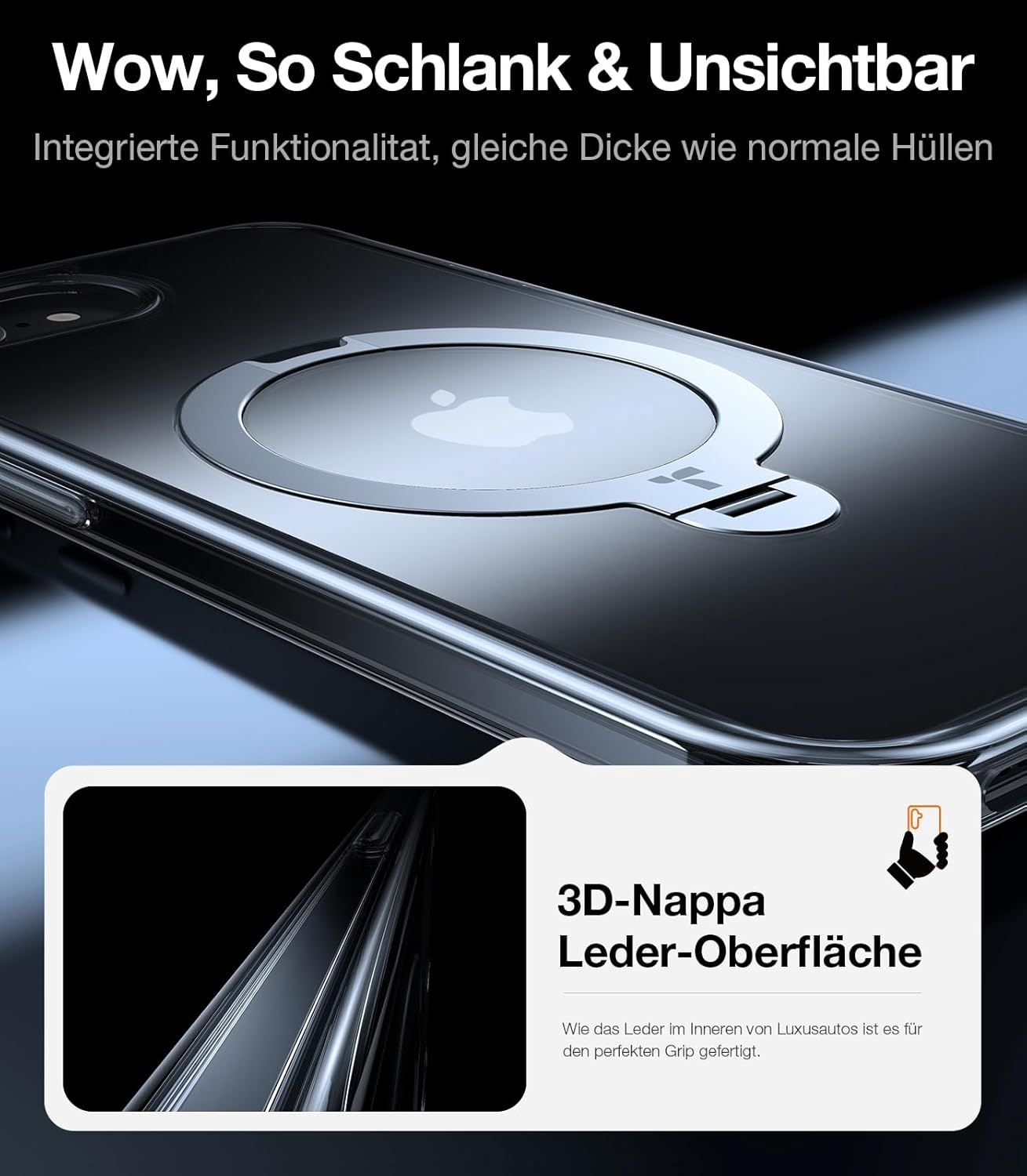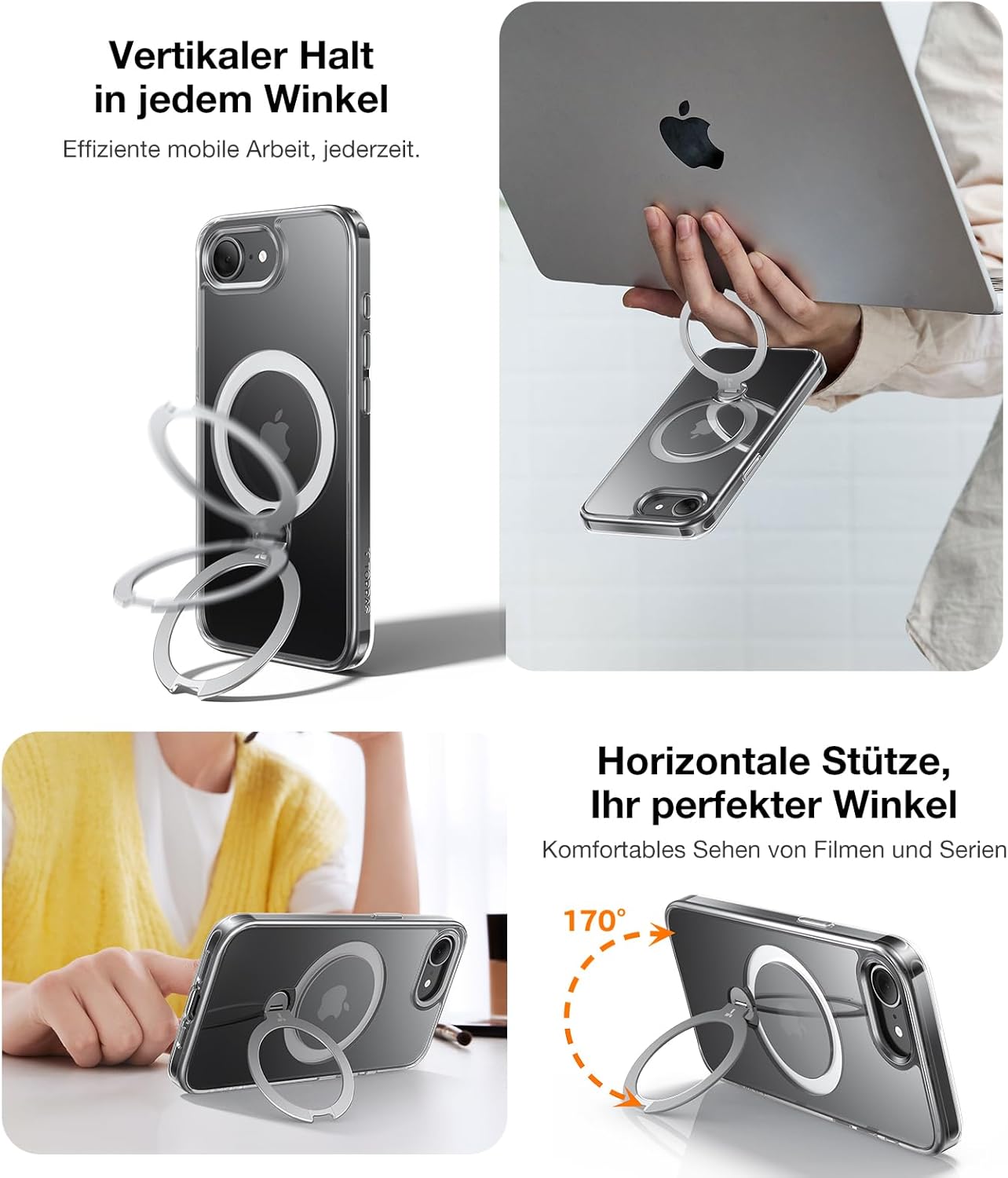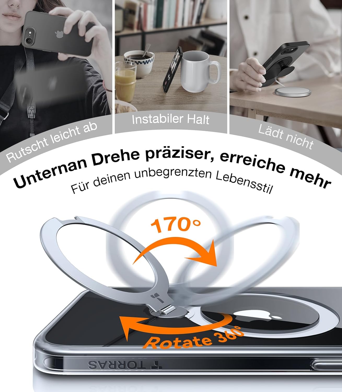 • [360-градусов пръстен за стойка: Стабилизиран за всеки желан ъгъл: Завъртането осигурява 360° завъртане и четириточково позициониране за най-стабилен ъгъл. С максимална гъвкавост можете да регулирате хоризонтално изгледа от 15° до 160° и вертикално от 30° до 90°. Независимо дали гледате видеоконференции или провеждате дълги телефонни разговори, калъфът за iPhone 17 Pro може лесно да се регулира до желания ъгъл и по този начин осигурява максимален комфорт в свободното време и по-голяма ефективност на работното място.]