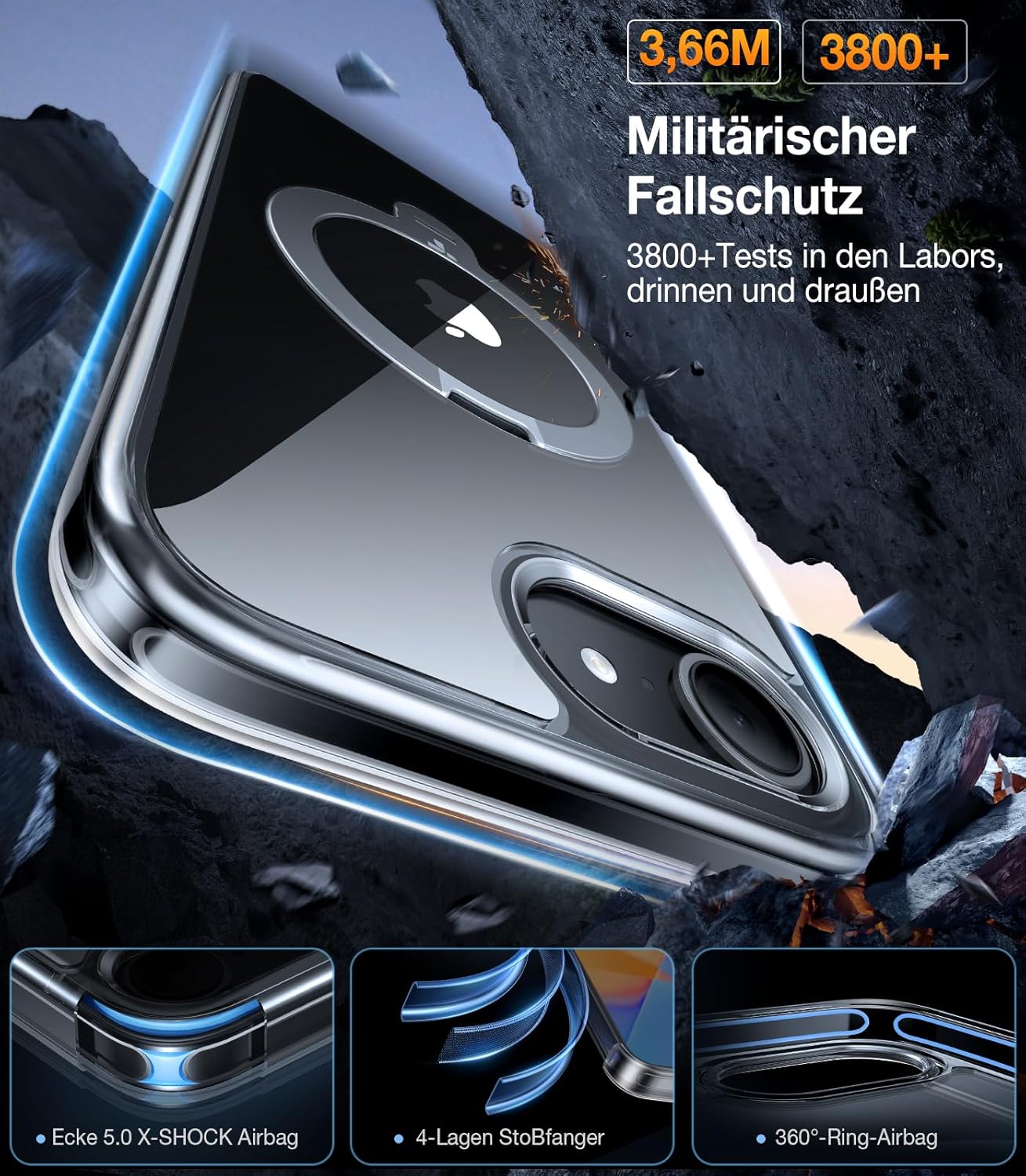 • Професионална концепция за защита: Защитени бутони на камерата, издържат на всяко падане: Невидима защита на бутоните - пълна функционалност. Калъфът за телефон е издържал на строги тестове за падане от 3,66 м, за истинска 3-посочна военна защита. С три слоя ултраиздръжлив материал, вградена 360° амортисьорна въздушна възглавница и X-Shock конструкция по ъглите, той осигурява несравнима защита за безпроблемна употреба. Защитата на обективите на камерата и извивките на екрана повишава безопасността.