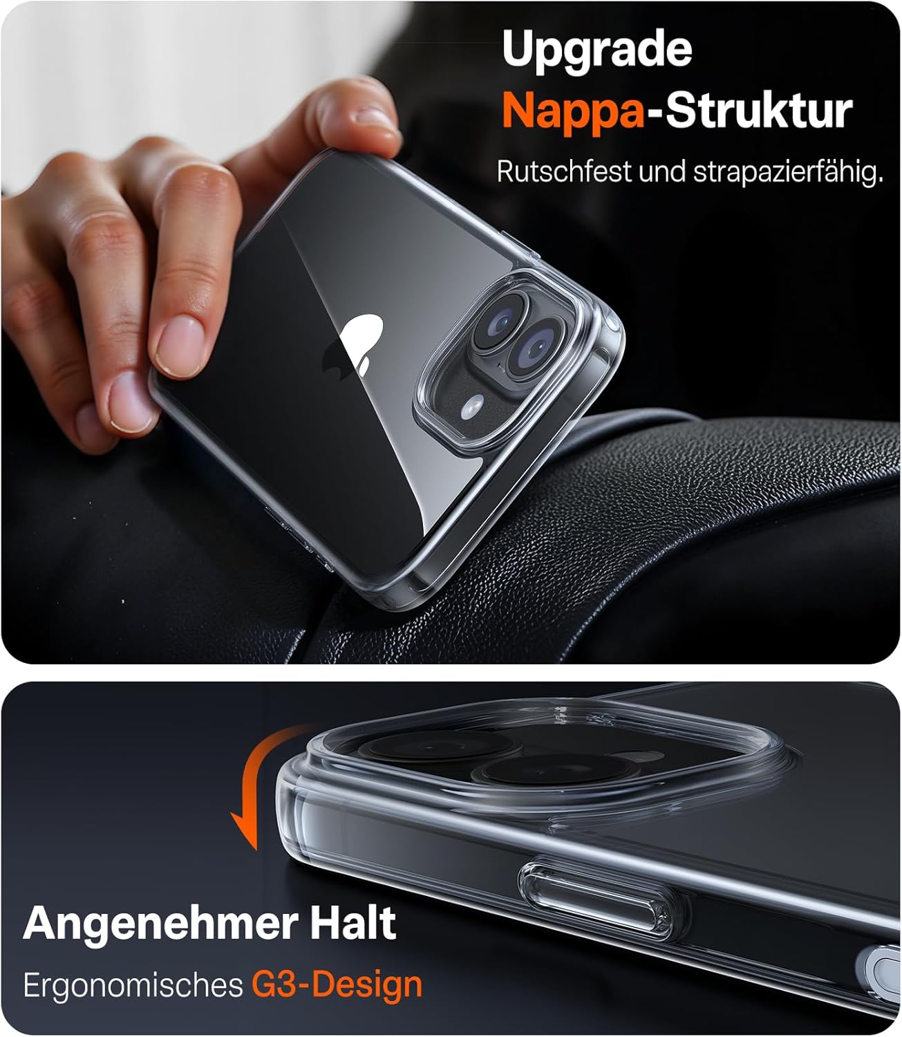 • Премиум допир, неплъзгащ се: Рамката на защитния калъф за iPhone 17 Pro е снабдена с 3D Nappa текстура, която осигурява фин, удобен захват и същевременно има неплъзгащ се ефект - за повече безопасност в ежедневието. Ергономичният дизайн на извивката G4 приляга особено добре в ръката. Повърхността е завършена и с олеофобно и хидрофобно нанопокритие за ефективно намаляване на пръстовите отпечатъци.