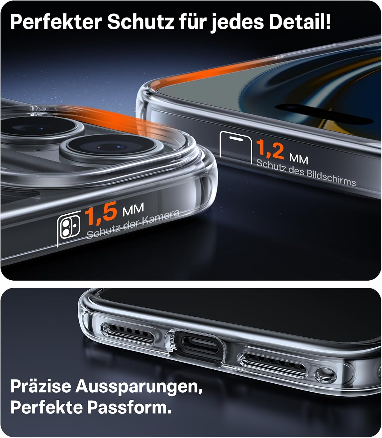 • Защитава всеки детайл, дисплей и камера: Калъфът за мобилен телефон iPhone 17 Pro има повдигнат ръб от 1,2 мм около екрана и повдигнат ръб от 1,5 мм над камерата, които осигуряват изключително ефективна защита срещу надраскване за най-скъпите и крехки части на вашия мобилен телефон. Всеки ръб, ъгъл и повърхност са подсилени, за да създадат непревземаема защита за вашия iPhone. Така можете да останете спокойни след всеки инцидент.