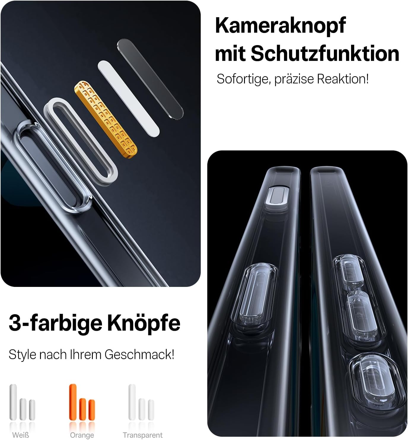 • Защита на бутона на камерата: Калъфът за iPhone 17 Pro предпазва бутона на камерата от драскотини и удари с издръжливо стъклено покритие, докато проводимите медни пластини и носещата структура от поликарбонат (PC) осигуряват прецизно и чувствително усещане при работа, подобно на оригинала.