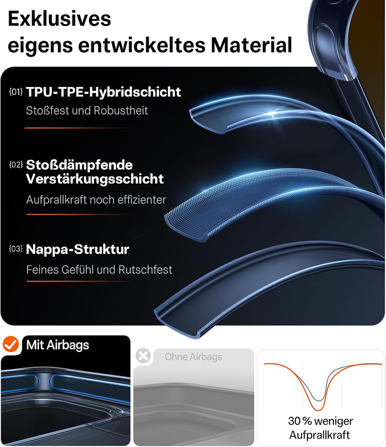 • Премиум допир, неплъзгащ се: Рамката на защитния калъф за iPhone 17 Pro е снабдена с 3D Nappa текстура, която осигурява фин, удобен захват и същевременно има неплъзгащ се ефект - за повече безопасност в ежедневието. Ергономичният дизайн на извивката G4 приляга особено добре в ръката. Повърхността е завършена и с олеофобно и хидрофобно нанопокритие за ефективно намаляване на пръстовите отпечатъци.