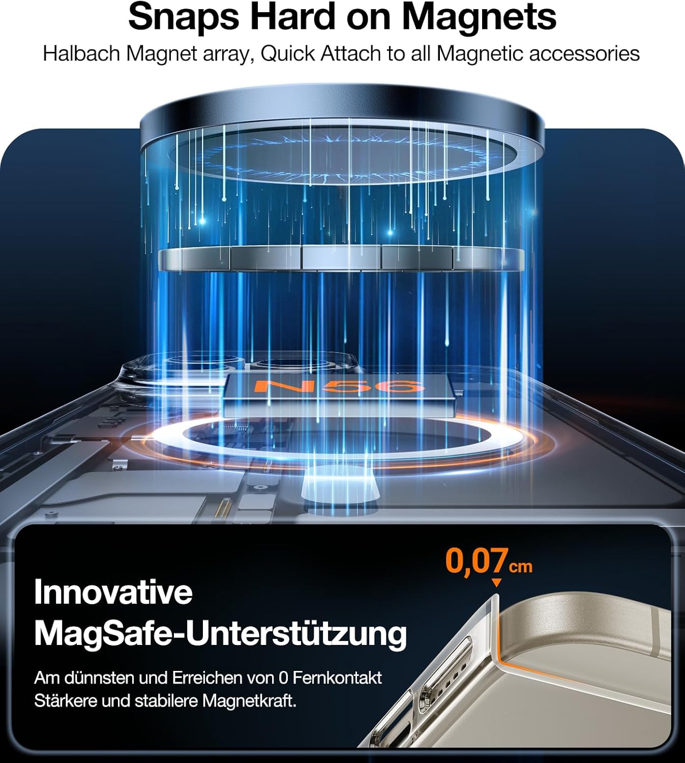 • Ултратънък и следователно с най-силна магнитна сила: TORRAS е запазил сложното лазерно гравиране, както и технологията за CNC шлифоване, и е намалил дебелината на калъфа за iPhone 17 Pro до само 0,07 см. Гърбът приляга почти безпроблемно към телефона. Благодарение на най-силните магнити N56 и технологията Halbach array, калъфът постига магнитна сила от 19 N, което е много силно и е напълно съвместимо с аксесоарите MagSafe, като същевременно е ултратънък.
