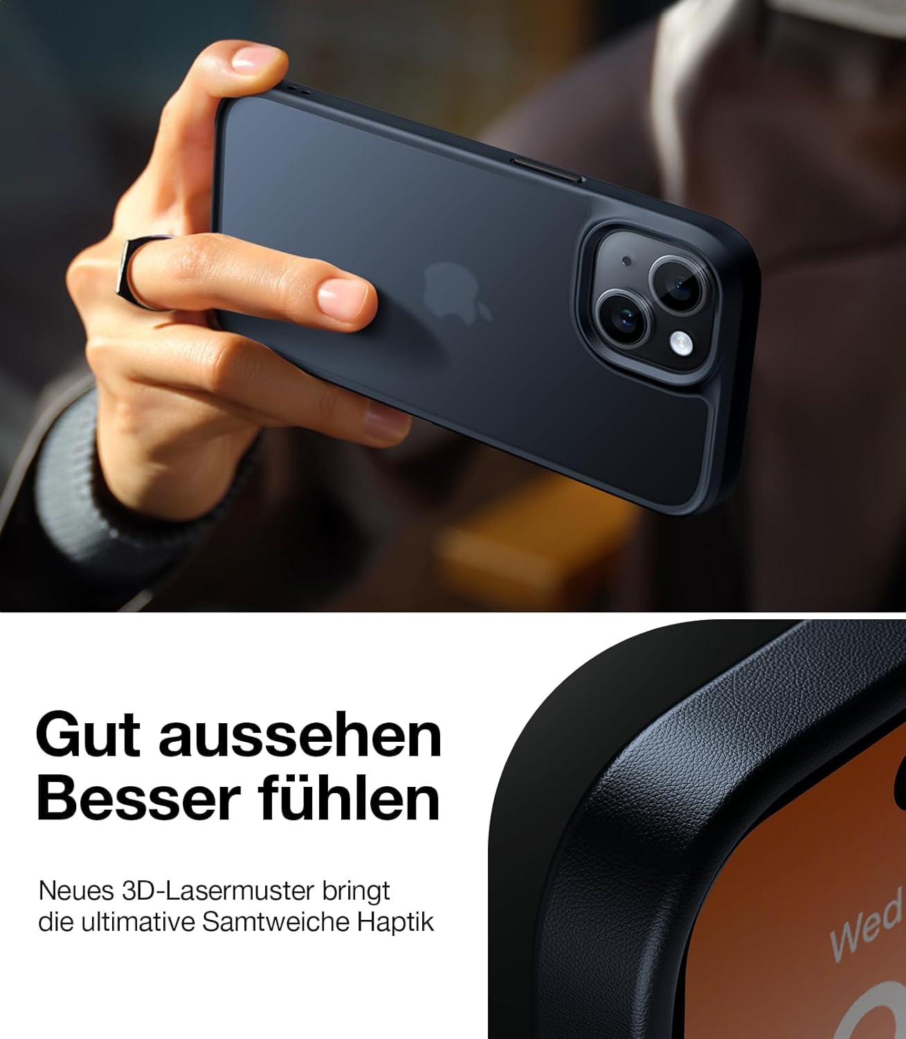 • Премиум допир, неплъзгащ се: Рамката на защитния калъф за iPhone 17 Pro е снабдена с 3D Nappa текстура, която осигурява фин, удобен захват и същевременно има неплъзгащ се ефект - за повече безопасност в ежедневието. Ергономичният дизайн на извивката G4 приляга особено добре в ръката. Повърхността е завършена и с олеофобно и хидрофобно нанопокритие за ефективно намаляване на пръстовите отпечатъци.