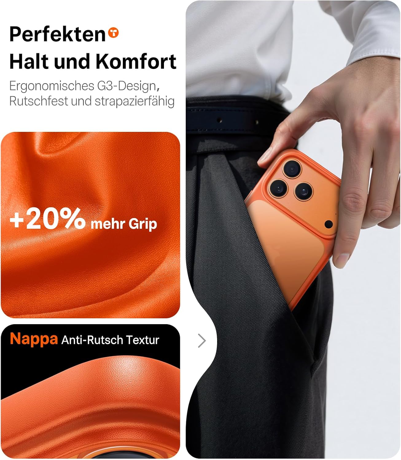 • Премиум допир, неплъзгащ се: Рамката на защитния калъф за iPhone 17 Pro е снабдена с 3D Nappa текстура, която осигурява фин, удобен захват и същевременно има неплъзгащ се ефект - за повече безопасност в ежедневието. Ергономичният дизайн на извивката G4 приляга особено добре в ръката. Повърхността е завършена и с олеофобно и хидрофобно нанопокритие за ефективно намаляване на пръстовите отпечатъци.