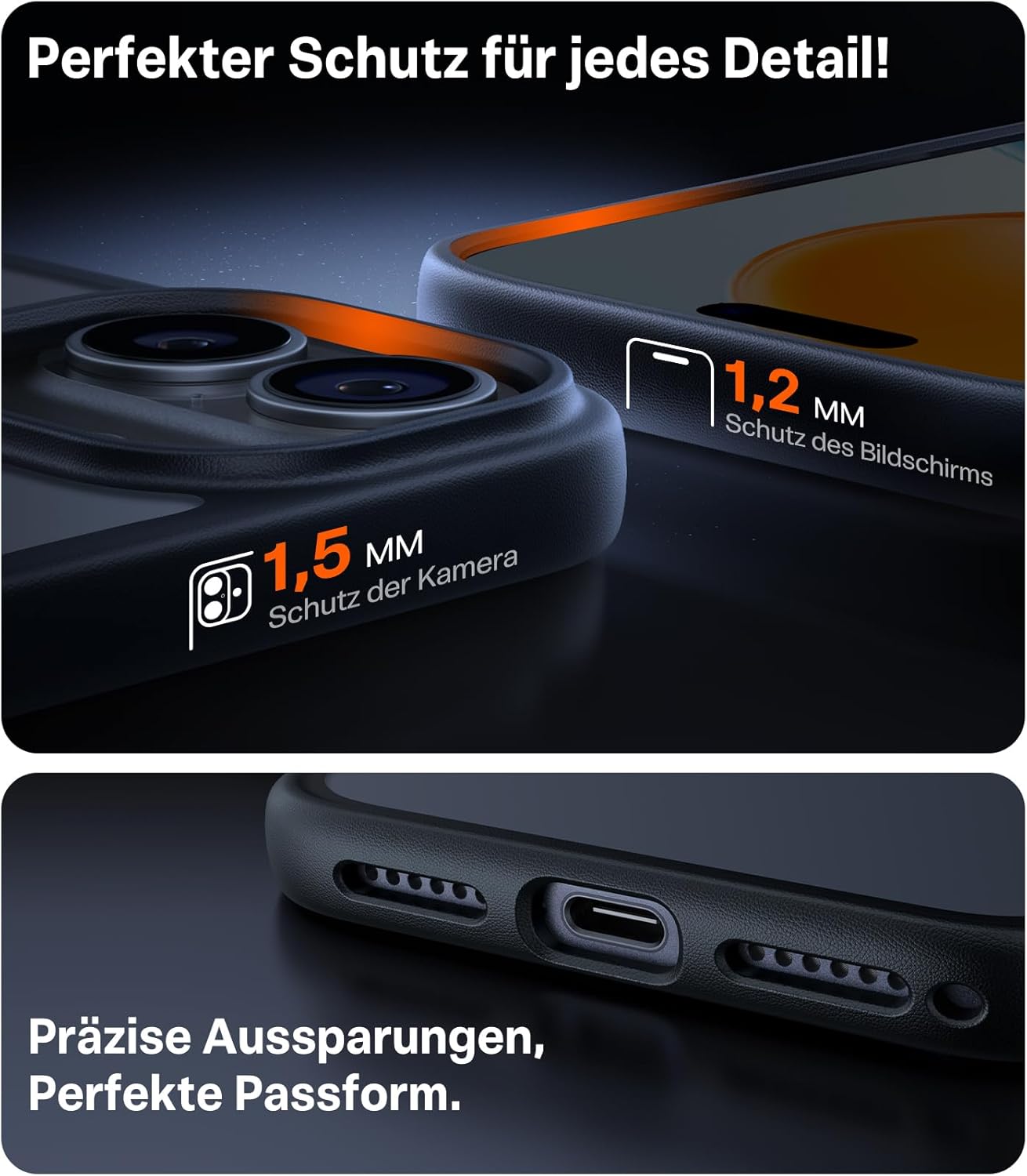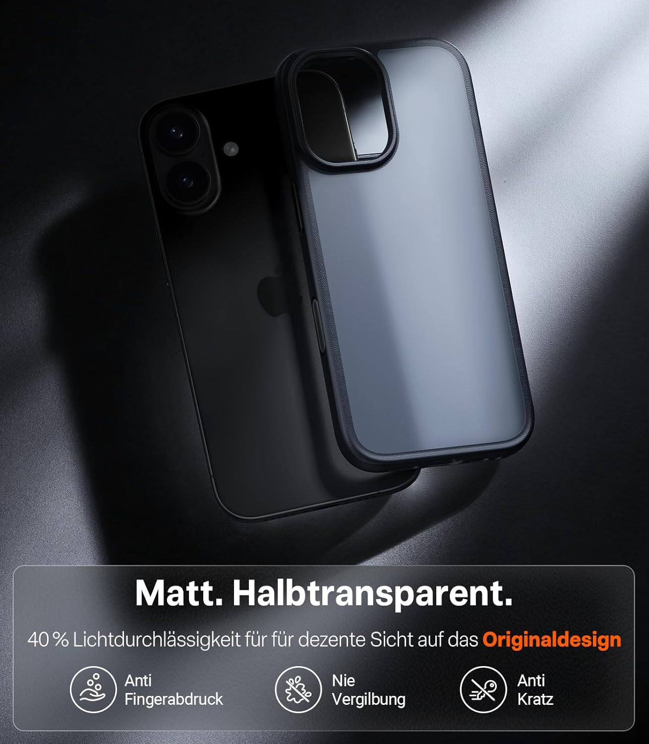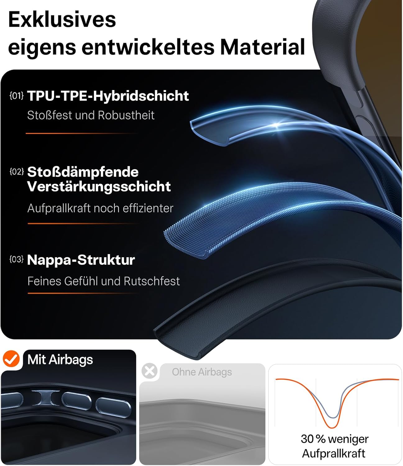 • Премиум допир, неплъзгащ се: Рамката на защитния калъф за iPhone 17 Pro е снабдена с 3D Nappa текстура, която осигурява фин, удобен захват и същевременно има неплъзгащ се ефект - за повече безопасност в ежедневието. Ергономичният дизайн на извивката G4 приляга особено добре в ръката. Повърхността е завършена и с олеофобно и хидрофобно нанопокритие за ефективно намаляване на пръстовите отпечатъци.
