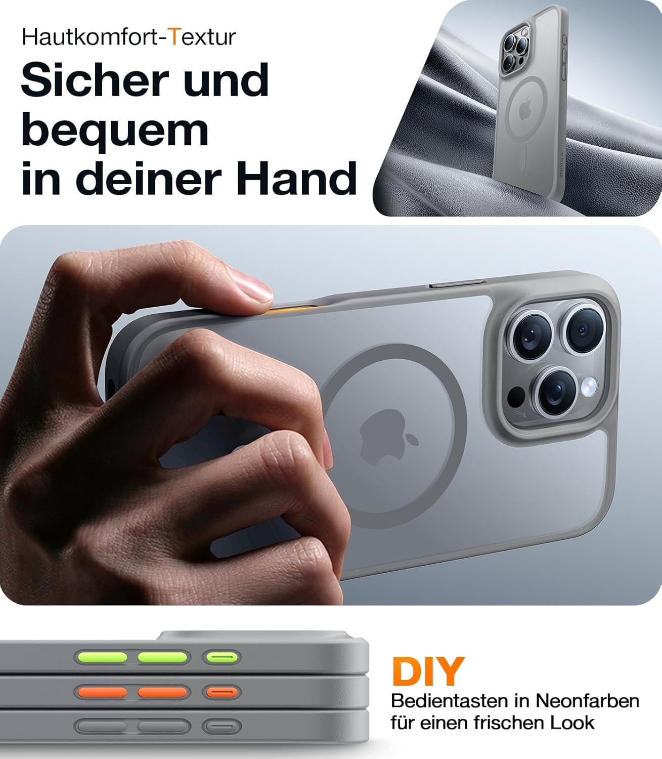 TORRAS Guardian-Mag калъф за iPhone 16 Pro Max с MagSafe (най-добра военна защита и магнитна сила) изключително издръжлив калъф за мобилен телефон за iPhone 16 Pro Max кадифен тънък с бутони „направи си сам“, сив