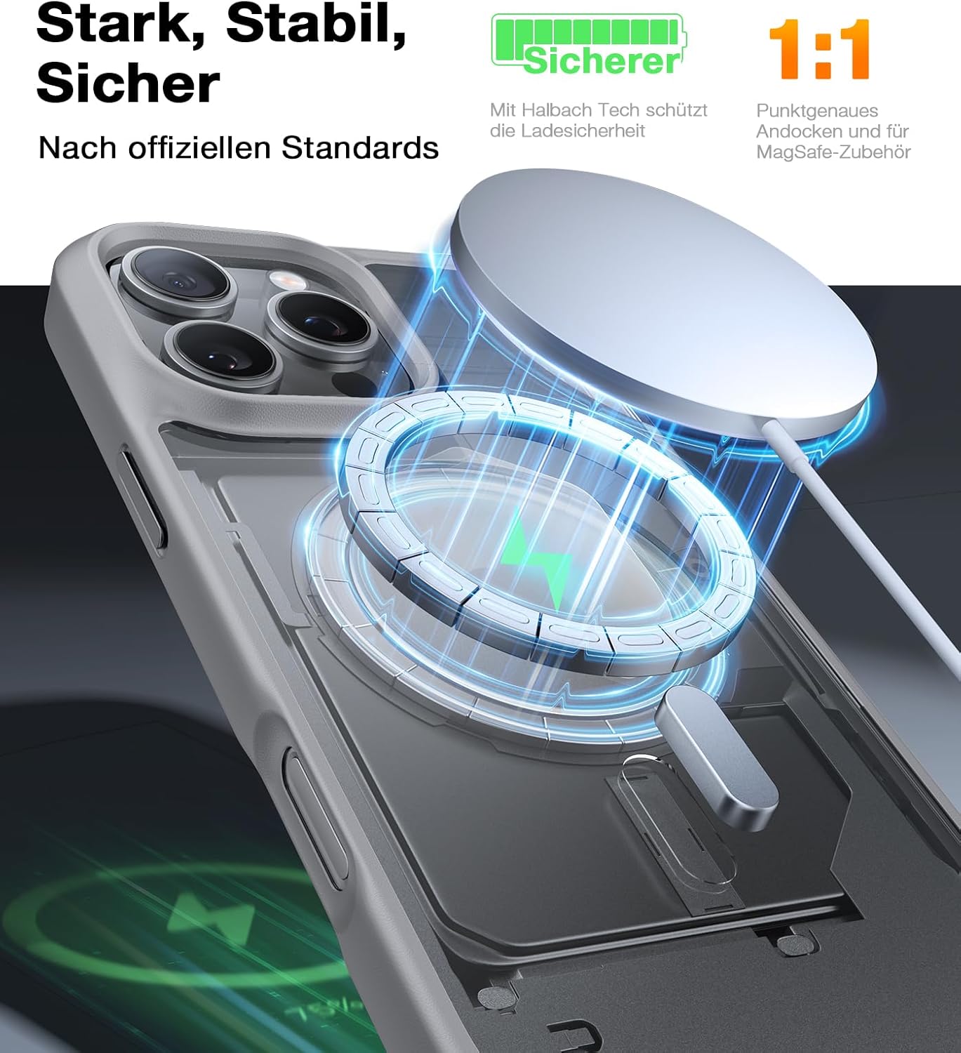 • Максимална защита за iPhone 17 Pro: Този калъф за iPhone 17 Pro комбинира взривоустойчиви композитни материали от термопластичен полиуретан (TPU) + термопластичен еластомер (TPE) с патентованата технология MilShock в четирите ъгъла. Лабораторно тестван, той е устойчив на падания от височина 4 м и е издържал лесно на над 5000 теста за падане. Заедно с повдигнатата 2,5 мм защита на камерата и 1,8 мм високия ръб на дисплея, той образува 360° защитна система, която надеждно защитава вашия iPhone 17 Pro от ежедневни падания и екстремни натоварвания.