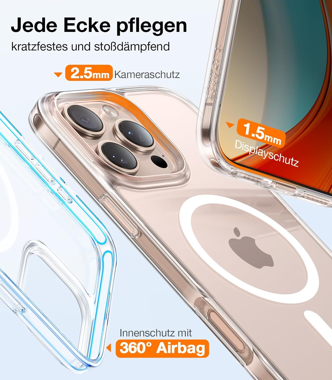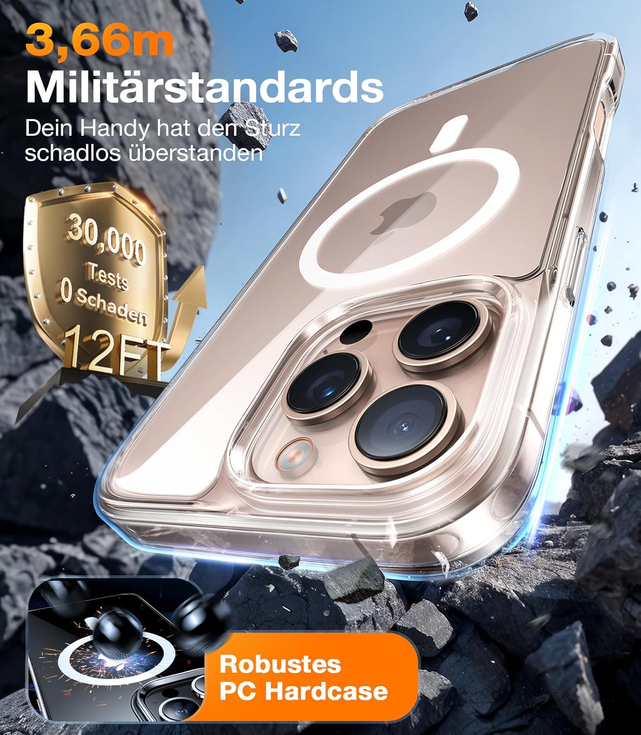• Максимална защита за iPhone 17 Pro: Този калъф за iPhone 17 Pro комбинира взривоустойчиви композитни материали от термопластичен полиуретан (TPU) + термопластичен еластомер (TPE) с патентованата технология MilShock в четирите ъгъла. Лабораторно тестван, той е устойчив на падания от височина 4 м и е издържал лесно на над 5000 теста за падане. Заедно с повдигнатата 2,5 мм защита на камерата и 1,8 мм високия ръб на дисплея, той образува 360° защитна система, която надеждно защитава вашия iPhone 17 Pro от ежедневни падания и екстремни натоварвания.