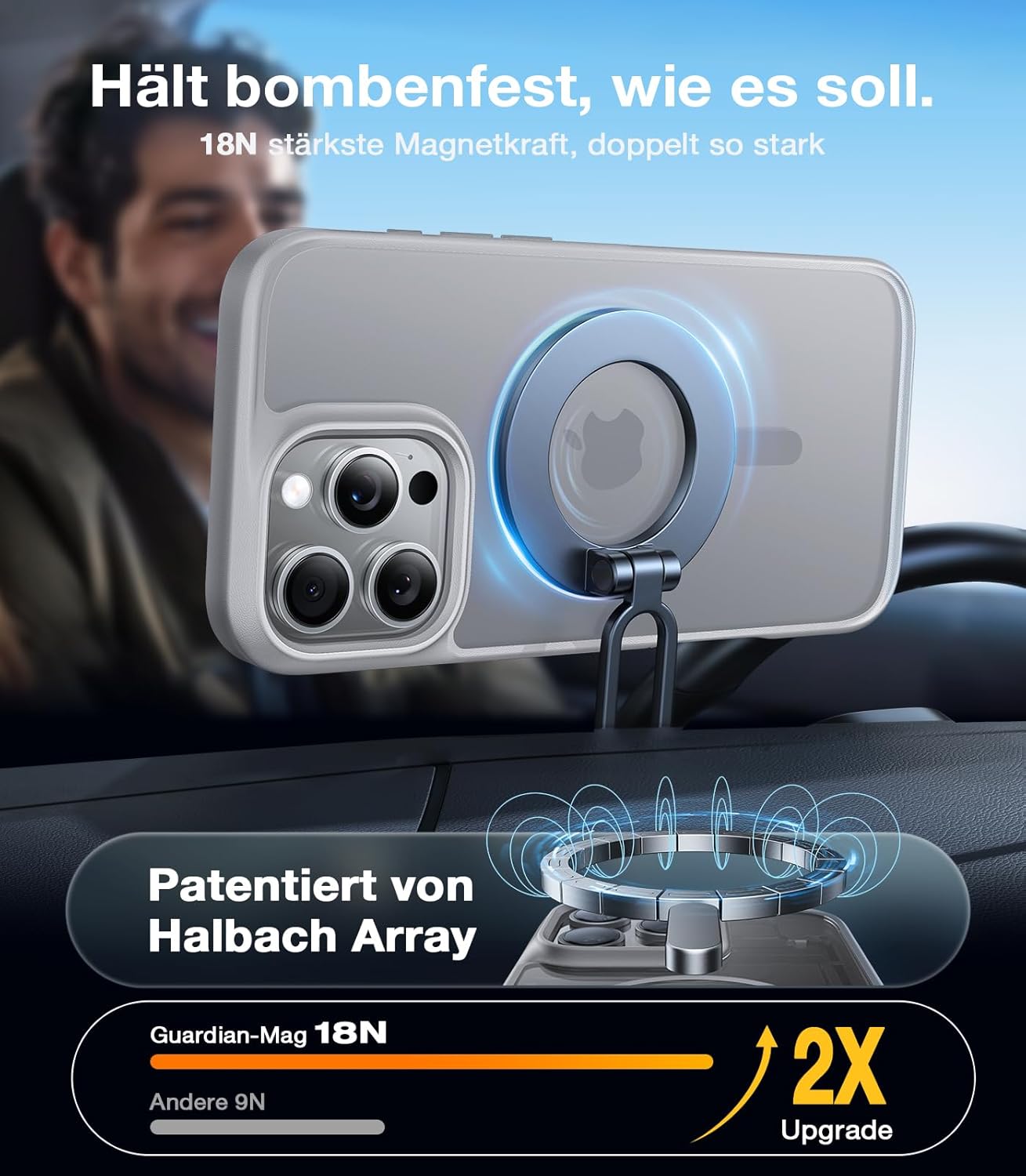 • Професионалното магнитно решение: Пробив в магнитната сила: Надстройте до редкоземни магнити N52 със сила на залепване от 18 N – надвишава оригиналната производителност; Интелигентно управление на заряда: Патентованата конструкция на магнитното поле намалява загубата на енергия с 15% при безжично зареждане и минимизира генерирането на топлина; Надеждна връзка: Перфектна съвместимост със зарядни устройства MagSafe, стойки за кола и други – за сигурно задържане в ежедневието и при пътуване.