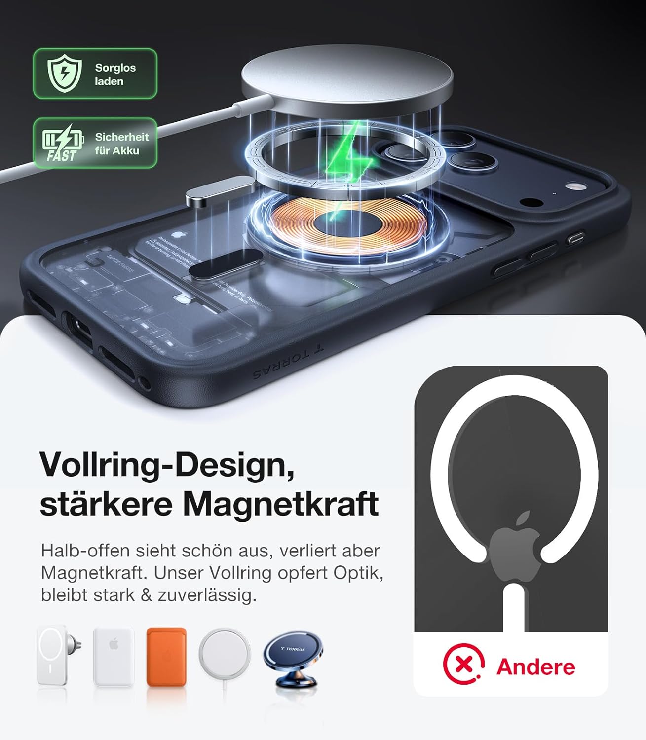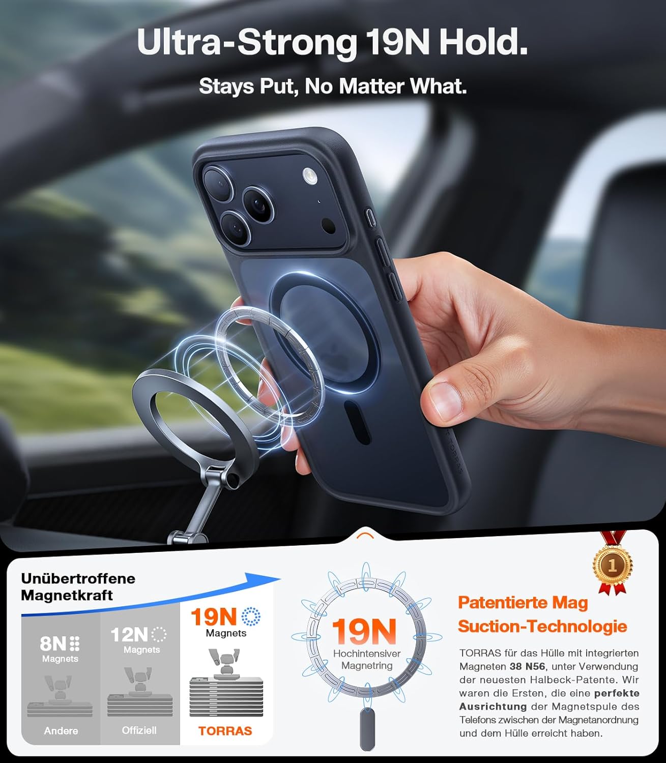 • Серията TORRAS Guardian-Mag – индустриалният еталон с над 13 милиона продажби по целия свят: Версията за iPhone 17 Pro съчетава три революционни основни технологии: редкоземни магнити N52 с водеща в индустрията сила на задържане от 18 N; система Military Airbag 4.0 + иновативен термопластичен полиуретанов (TPU)/термопластичен еластомер (TPE), сертифициран за защита от падане от 4 м; немски прецизен дизайн: ултратънък полупрозрачен гръб с дебелина 1,1 мм с G3 нано-захващащи ръбове за перфектно усещане.