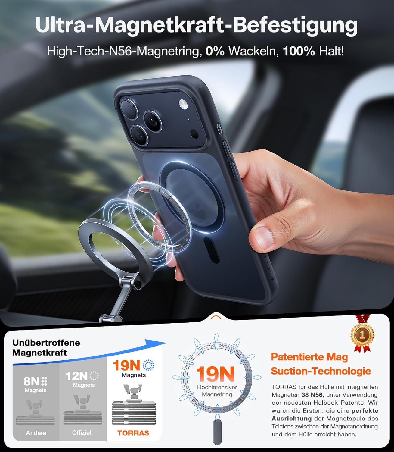 • Серията TORRAS Guardian-Mag – индустриалният еталон с над 13 милиона продажби по целия свят: Версията за iPhone 17 Pro съчетава три революционни основни технологии: редкоземни магнити N52 с водеща в индустрията сила на задържане от 18 N; система Military Airbag 4.0 + иновативен термопластичен полиуретанов (TPU)/термопластичен еластомер (TPE), сертифициран за защита от падане от 4 м; немски прецизен дизайн: ултратънък полупрозрачен гръб с дебелина 1,1 мм с G3 нано-захващащи ръбове за перфектно усещане.