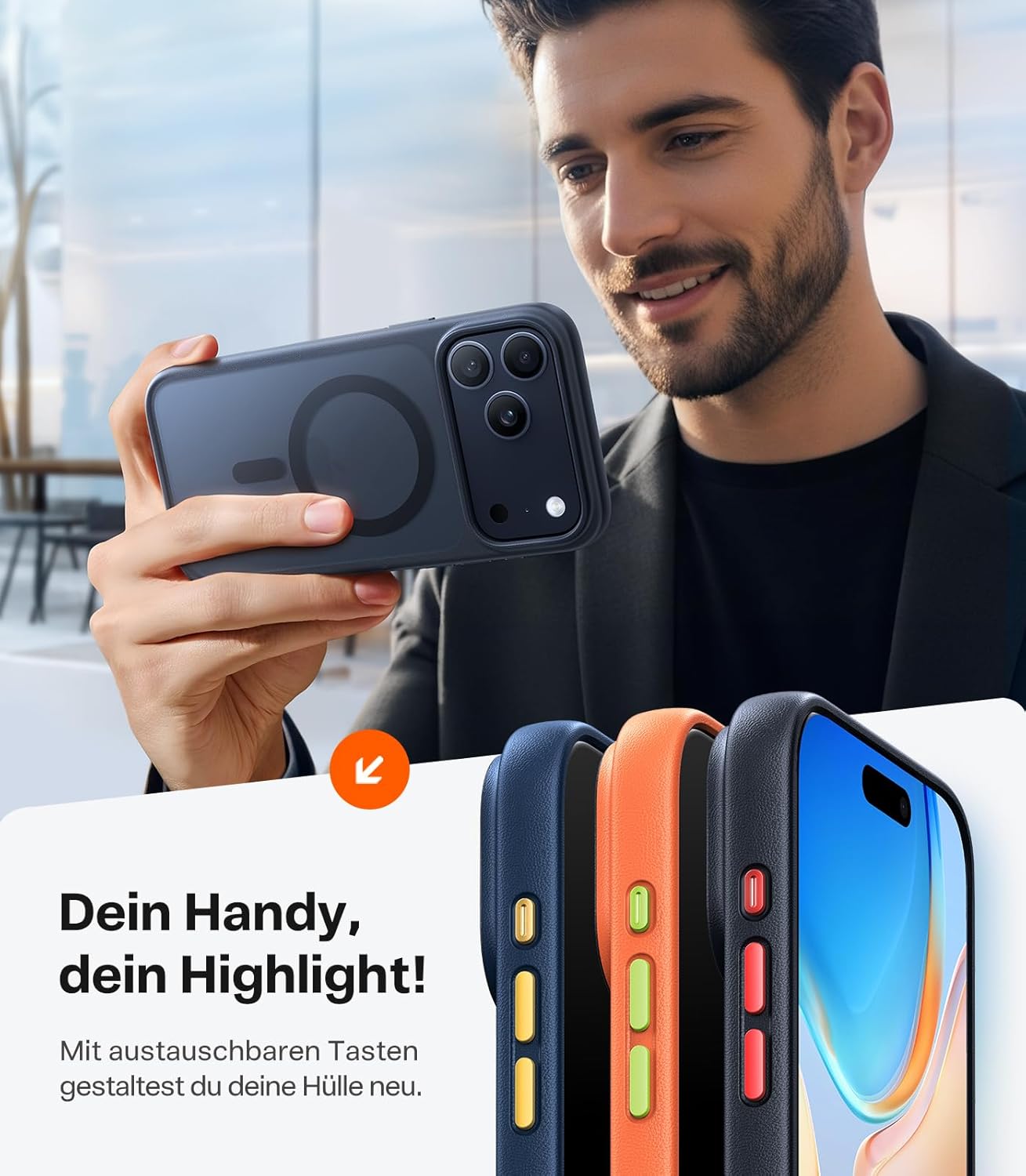 • Перфектни детайли за отлично качество: Калъфът за iPhone 17 Pro впечатлява с 45% пропускливост на светлина за елегантен дизайн и иновативна 3D лазерна текстура с нано покритие за първокласен комфорт при захващане. Подобрените метални бутони за изключване на звука реагират по-бързо, а модулният дизайн позволява персонализирани цветови комбинации. А прецизните изрези отразяват претенцията на TORRAS за съвършенство – перфектната комбинация от стил и функционалност.