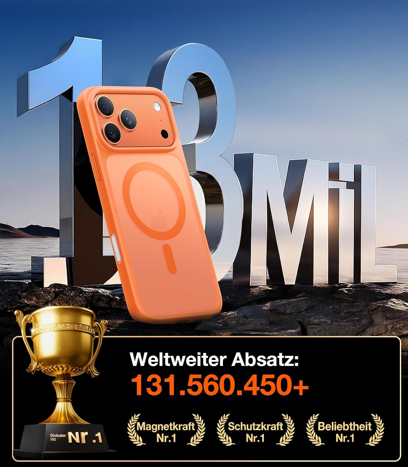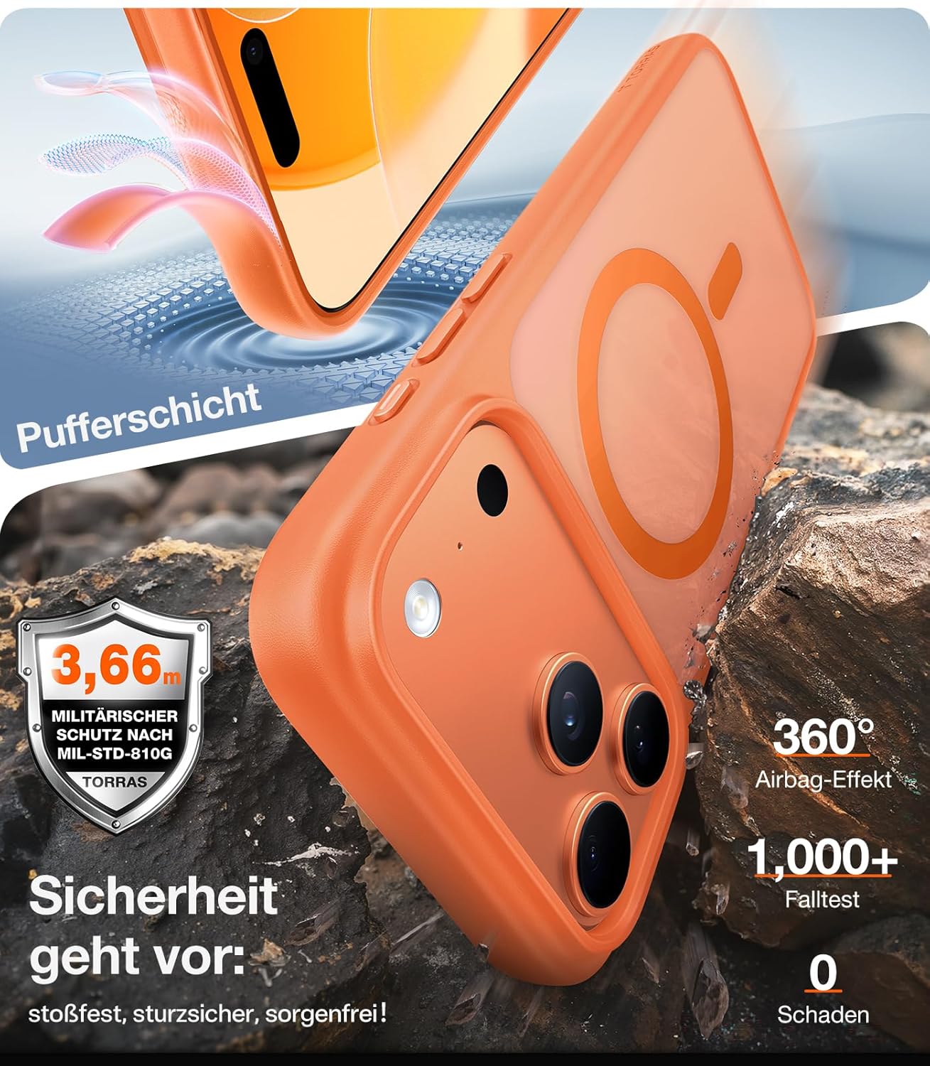 • Максимална защита за iPhone 17 Pro: Този калъф за iPhone 17 Pro комбинира взривоустойчиви композитни материали от термопластичен полиуретан (TPU) + термопластичен еластомер (TPE) с патентованата технология MilShock в четирите ъгъла. Лабораторно тестван, той е устойчив на падания от височина 4 м и е издържал лесно на над 5000 теста за падане. Заедно с повдигнатата 2,5 мм защита на камерата и 1,8 мм високия ръб на дисплея, той образува 360° защитна система, която надеждно защитава вашия iPhone 17 Pro от ежедневни падания и екстремни натоварвания.