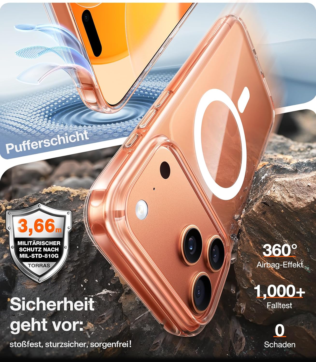 • Максимална защита за iPhone 17 Pro: Този калъф за iPhone 17 Pro комбинира взривоустойчиви композитни материали от термопластичен полиуретан (TPU) + термопластичен еластомер (TPE) с патентованата технология MilShock в четирите ъгъла. Лабораторно тестван, той е устойчив на падания от височина 4 м и е издържал лесно на над 5000 теста за падане. Заедно с повдигнатата 2,5 мм защита на камерата и 1,8 мм високия ръб на дисплея, той образува 360° защитна система, която надеждно защитава вашия iPhone 17 Pro от ежедневни падания и екстремни натоварвания.