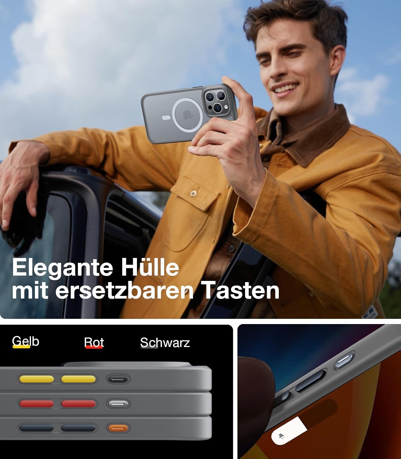• Перфектни детайли за отлично качество: Калъфът за iPhone 17 Pro впечатлява с 45% пропускливост на светлина за елегантен дизайн и иновативна 3D лазерна текстура с нано покритие за първокласен комфорт при захващане. Подобрените метални бутони за изключване на звука реагират по-бързо, а модулният дизайн позволява персонализирани цветови комбинации. А прецизните изрези отразяват претенцията на TORRAS за съвършенство – перфектната комбинация от стил и функционалност.
