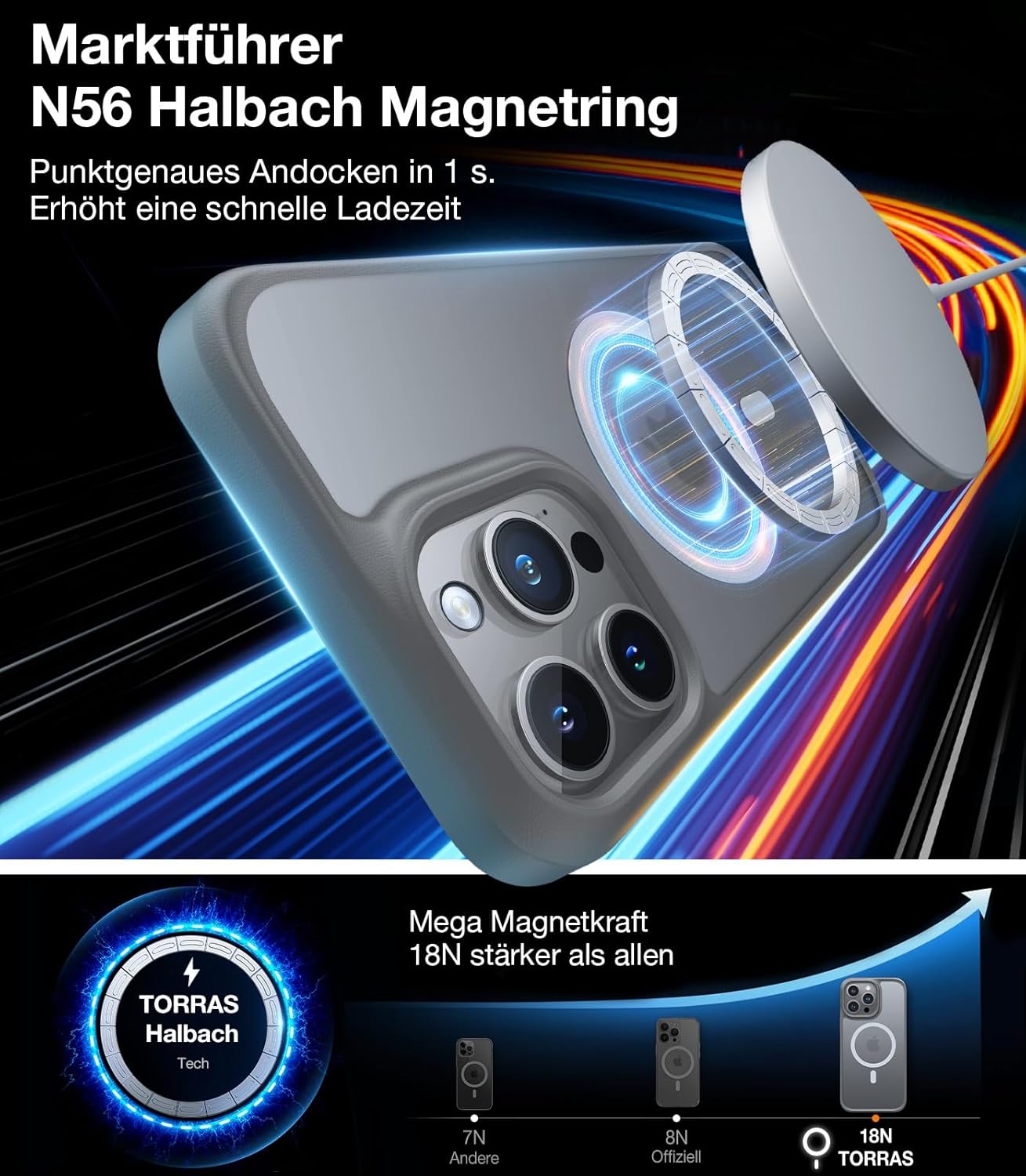 • Серията TORRAS Guardian-Mag – индустриалният еталон с над 13 милиона продажби по целия свят: Версията за iPhone 17 Pro съчетава три революционни основни технологии: редкоземни магнити N52 с водеща в индустрията сила на задържане от 18 N; система Military Airbag 4.0 + иновативен термопластичен полиуретанов (TPU)/термопластичен еластомер (TPE), сертифициран за защита от падане от 4 м; немски прецизен дизайн: ултратънък полупрозрачен гръб с дебелина 1,1 мм с G3 нано-захващащи ръбове за перфектно усещане.