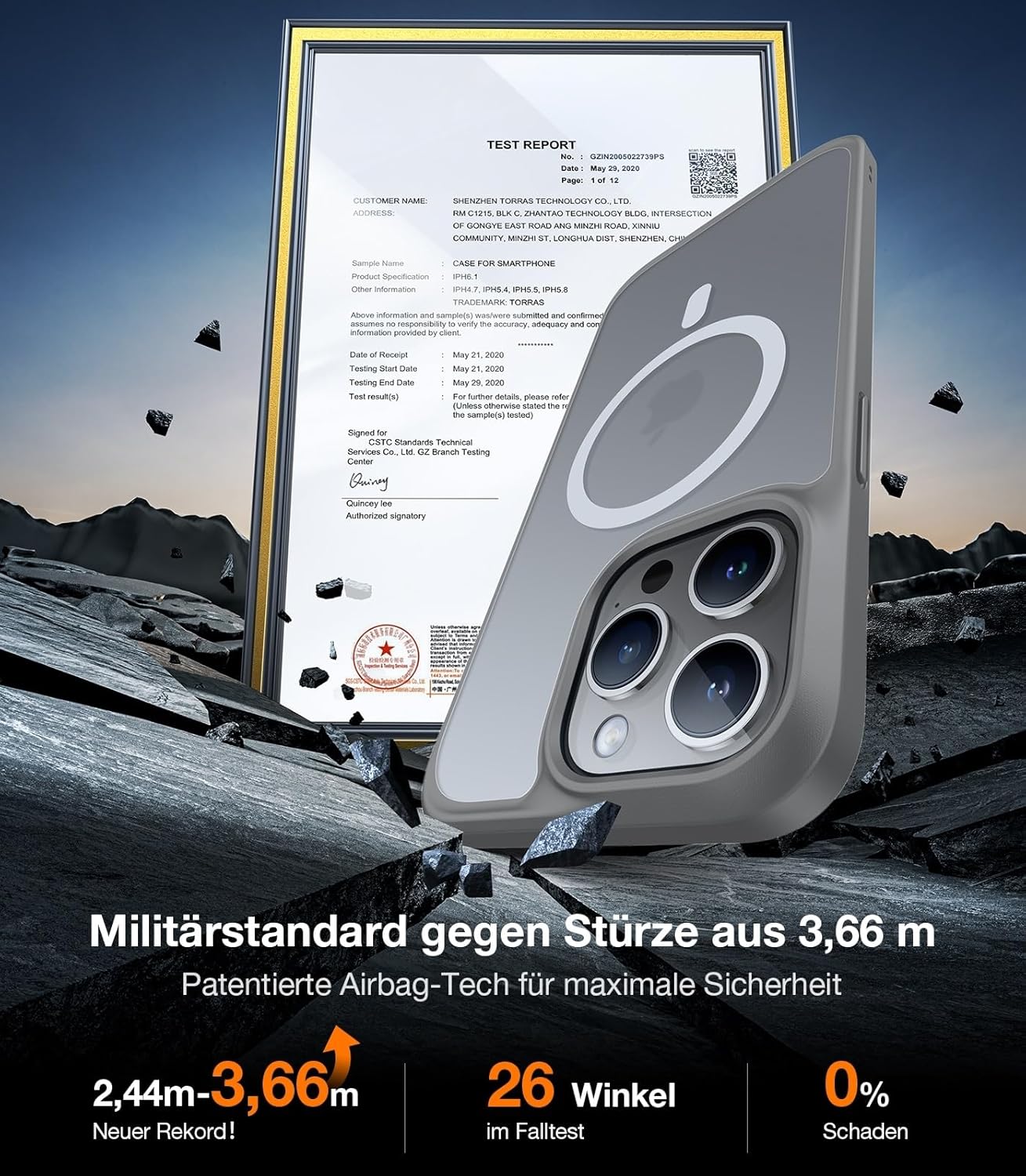 • Максимална защита за iPhone 17 Pro: Този калъф за iPhone 17 Pro комбинира взривоустойчиви композитни материали от термопластичен полиуретан (TPU) + термопластичен еластомер (TPE) с патентованата технология MilShock в четирите ъгъла. Лабораторно тестван, той е устойчив на падания от височина 4 м и е издържал лесно на над 5000 теста за падане. Заедно с повдигнатата 2,5 мм защита на камерата и 1,8 мм високия ръб на дисплея, той образува 360° защитна система, която надеждно защитава вашия iPhone 17 Pro от ежедневни падания и екстремни натоварвания.
