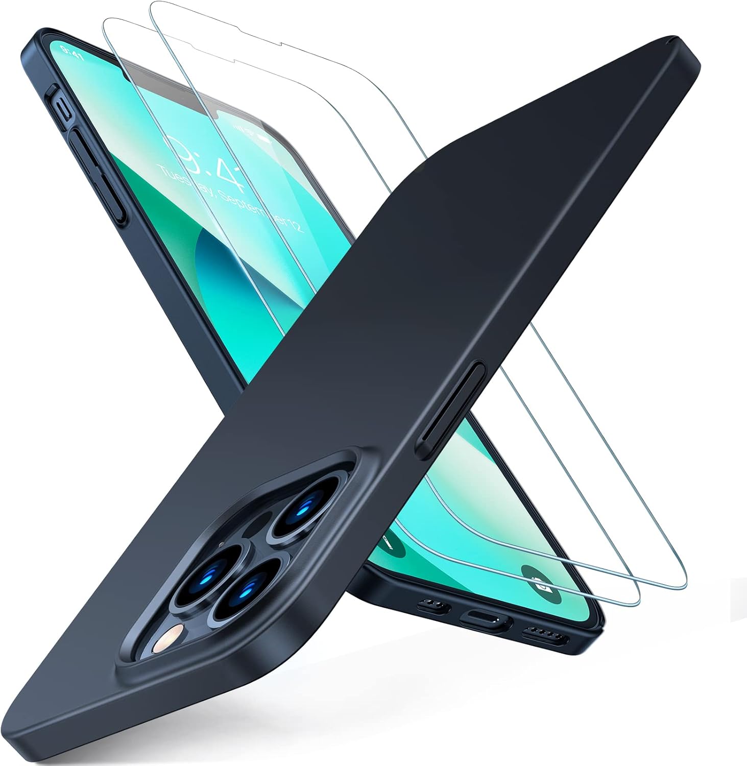 TORRAS Изключително тънък калъф за iPhone 13 Pro със защитно стъкло (1 калъф + 2 закалени стъкла), отличен устойчив на надраскване, против пръстови отпечатъци, копринено гладък матов тънък калъф за мобилен телефон за iPhone 13 Pro, серия Decency, черен