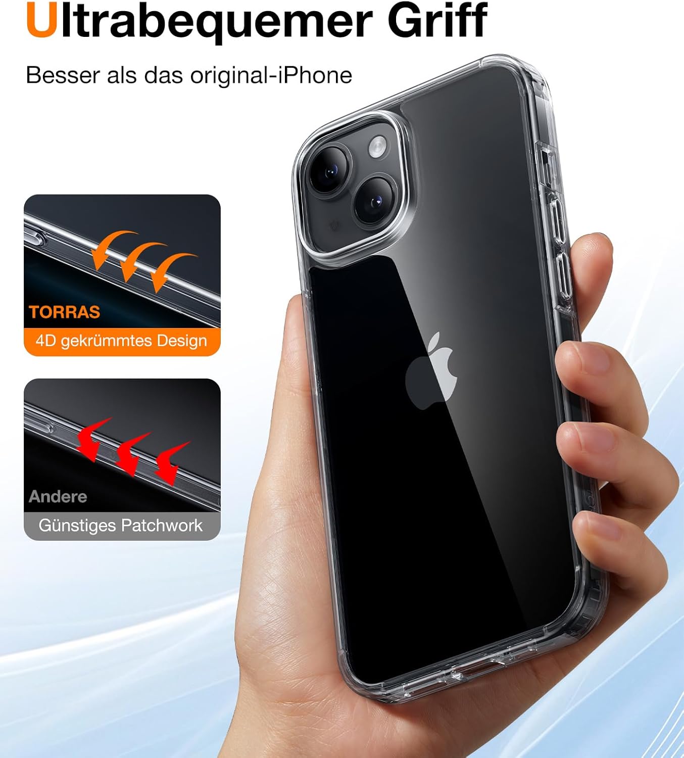 TORRAS Изключително тънък калъф за мобилен телефон за iPhone 15, 360-градусова всестранна защита, удароустойчив защитен калъф, кадифено покритие, стилен външен вид, прозрачен