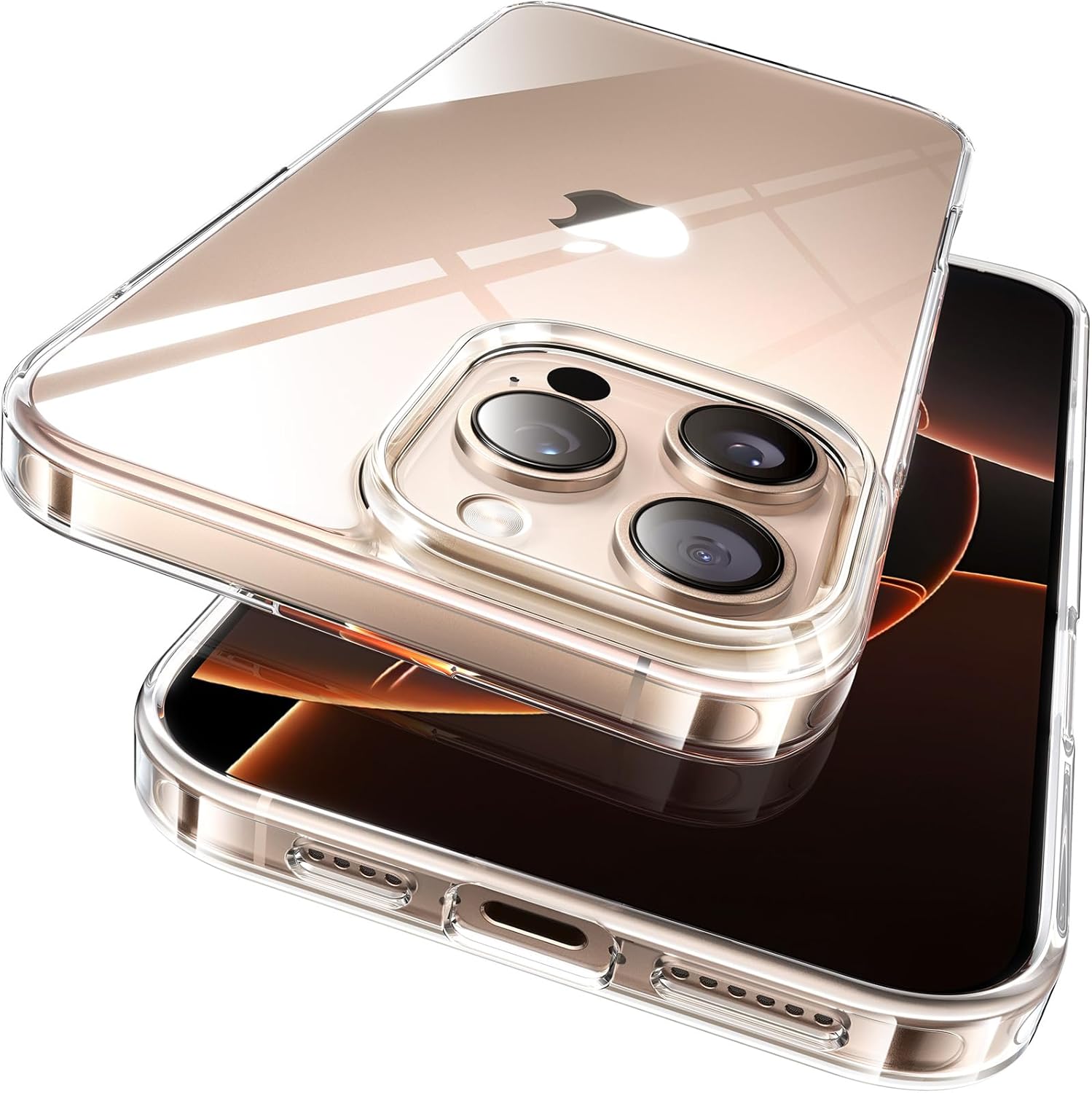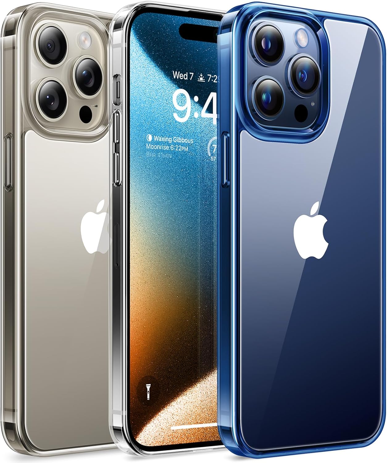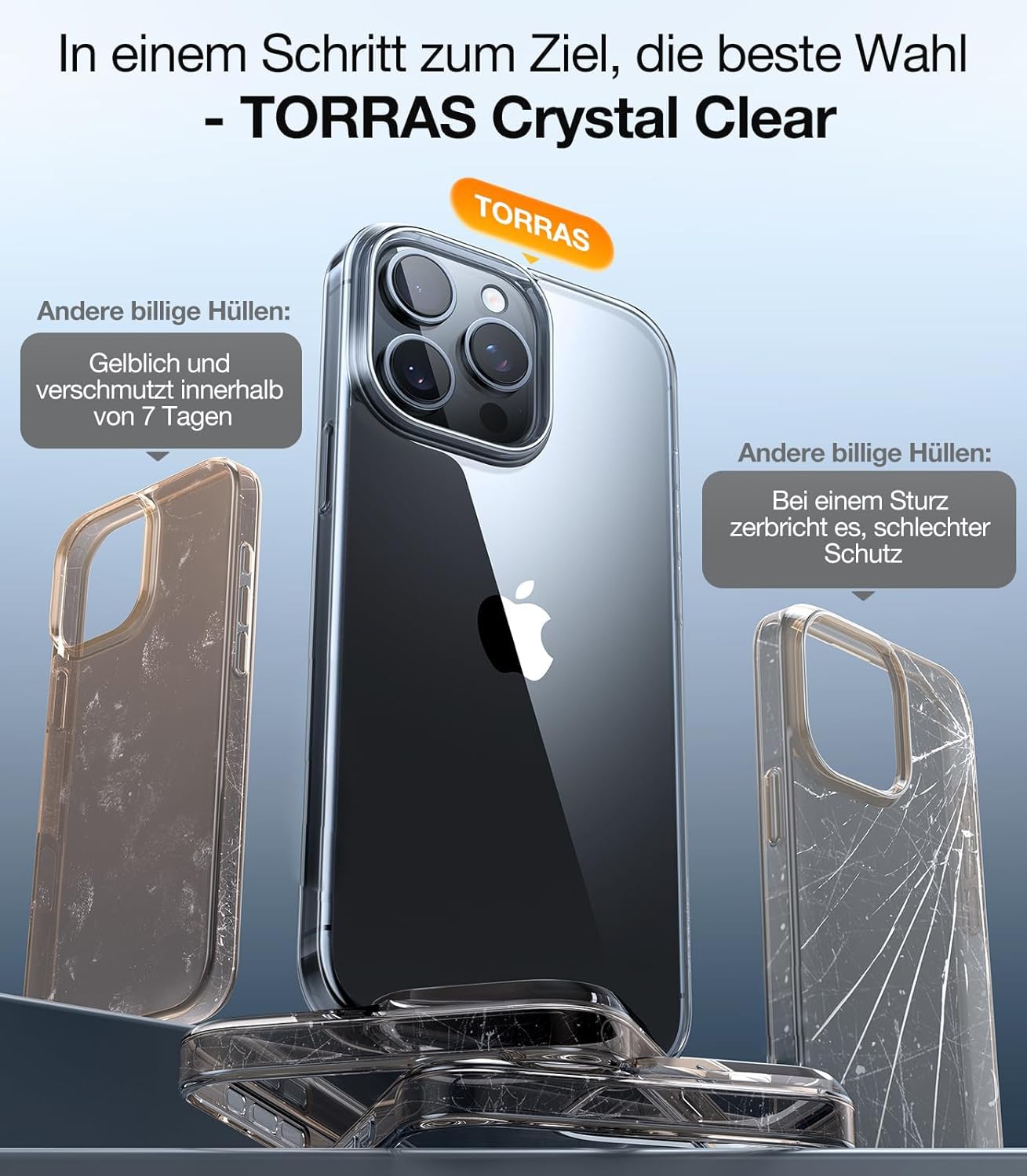 TORRAS Калъф против пожълтяване за iPhone 15 Pro, Прозрачен, 3.66 м Военна защита, Удароустойчив, 9H+ Прозрачен, Устойчив на надраскване гръб, Защитен калъф, Тънък калъф за мобилен телефон за iPhone 15 Pro