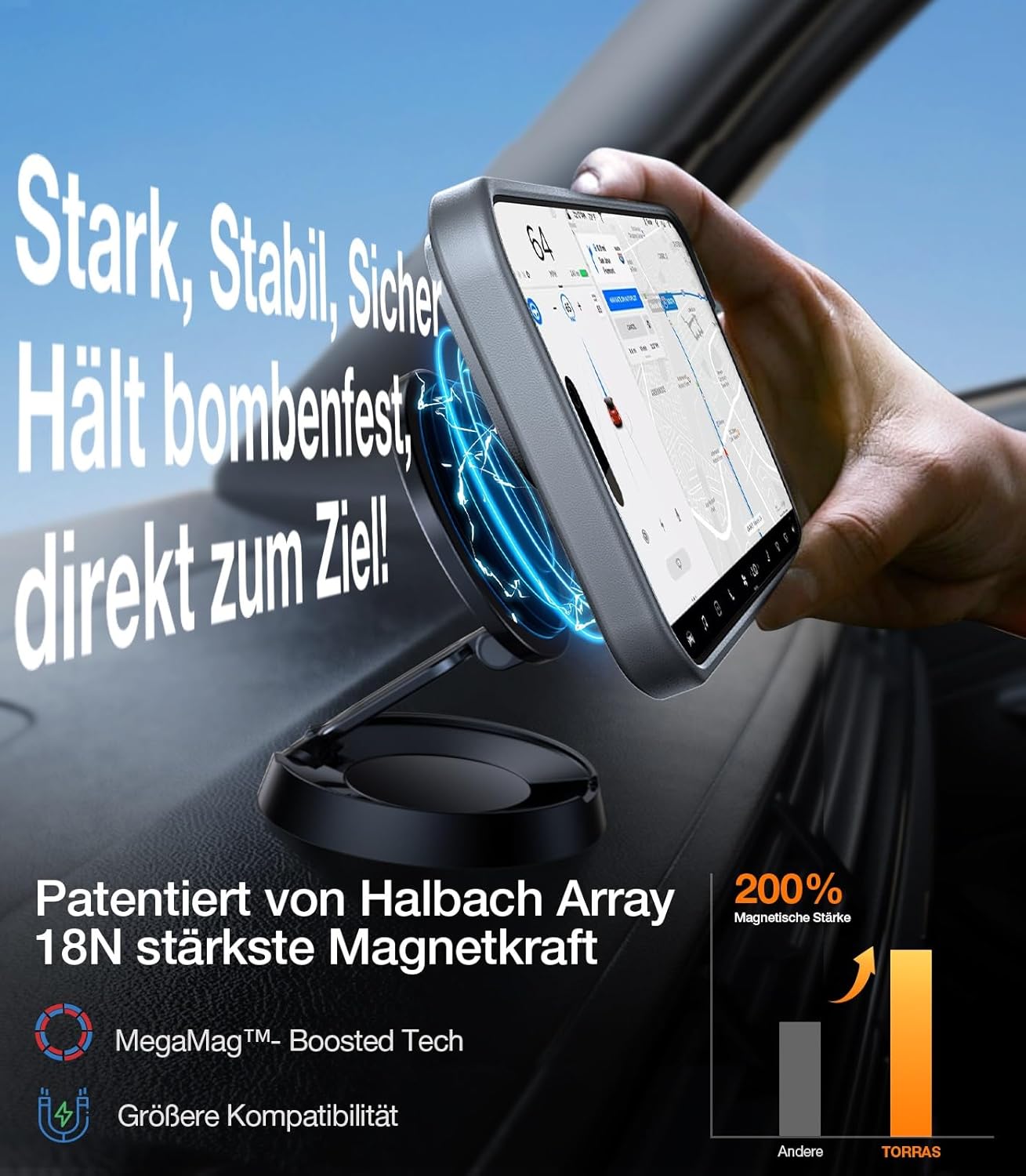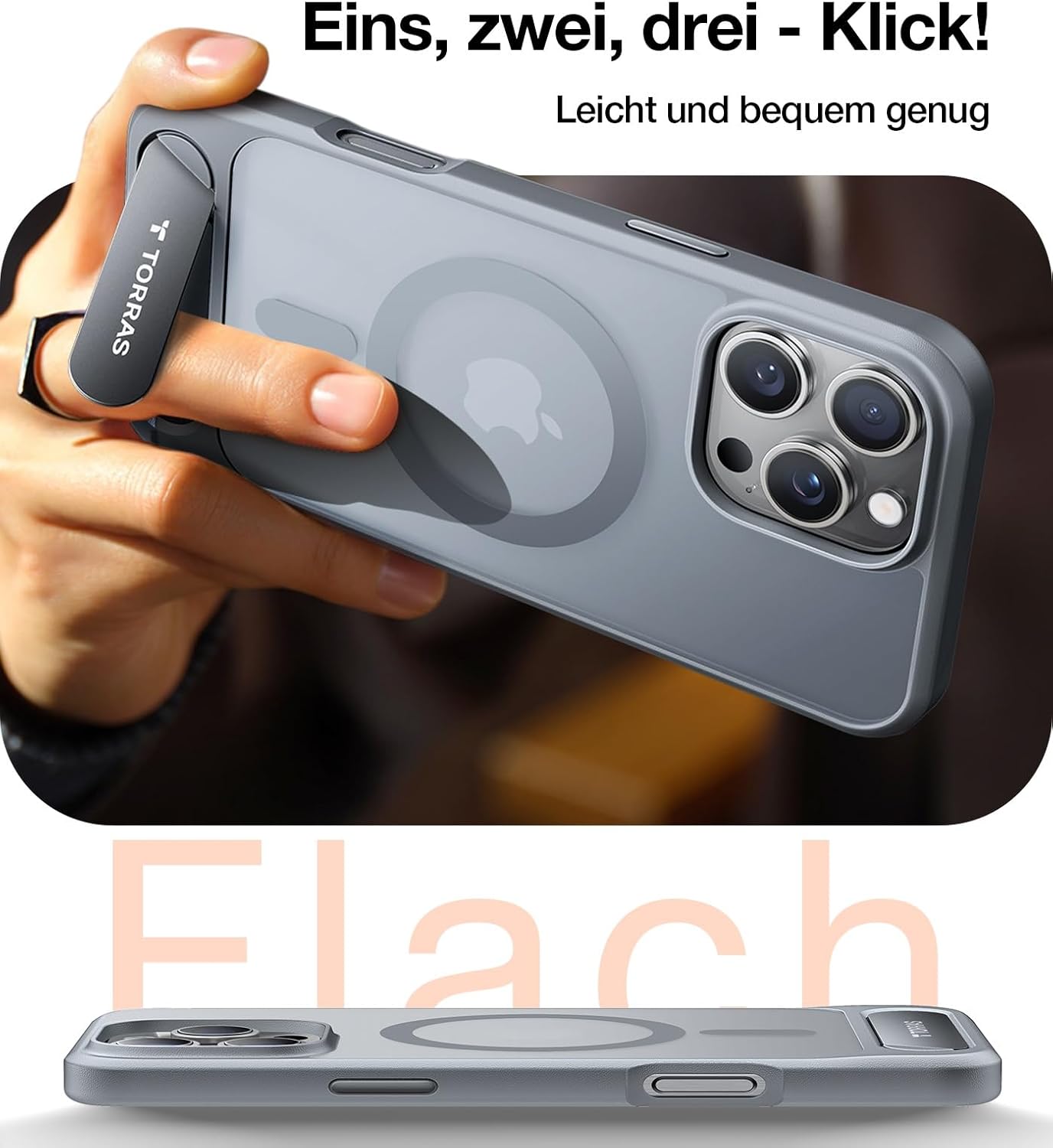 • Само магнити? Не - Магнитен с пълна функционалност. Дизайнът на магнитния пръстен пасва 1:1 на оригиналния магнитен пръстен на iPhone и е оборудван с патентованата система от магнити TORRAS Halbach, както и със силни магнити N52. Така че калъфът за мобилен телефон за iPhone 17 Pro се залепва здраво към оригинални магнитни аксесоари като държачи за кола, външни батерии или зарядни устройства, здраво задържащ, щадящ батерията. Бързо зареждане: Няма проблем - стабилно прилягане, без забавяне.