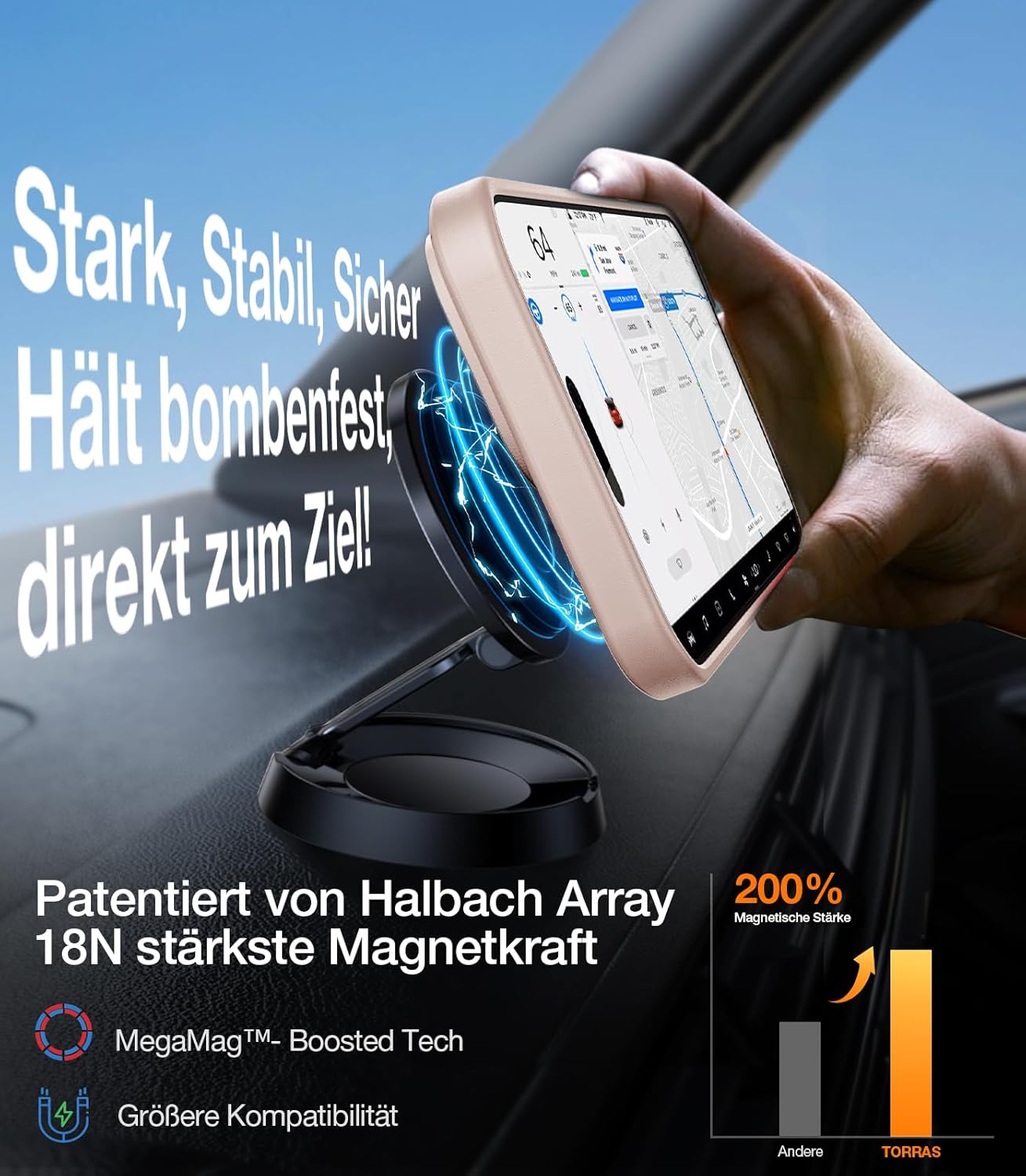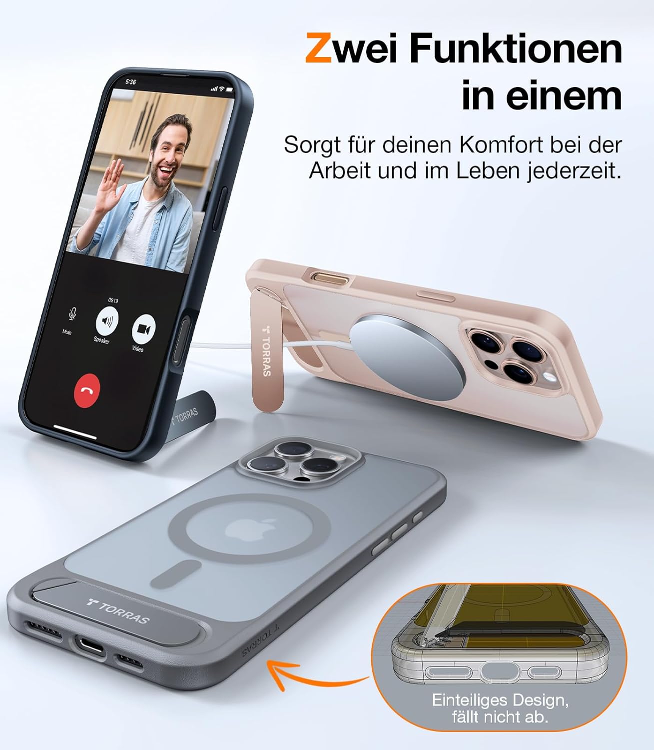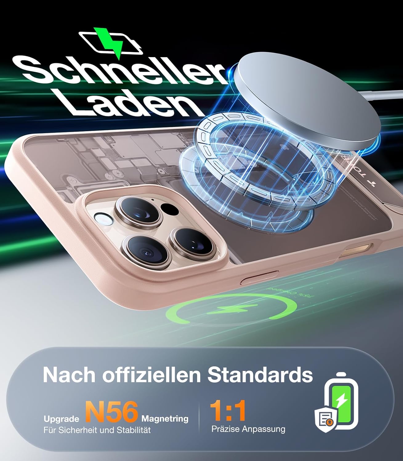 • Само магнити? Не - Магнитен с пълна функционалност. Дизайнът на магнитния пръстен пасва 1:1 на оригиналния магнитен пръстен на iPhone и е оборудван с патентованата система от магнити TORRAS Halbach, както и със силни магнити N52. Така че калъфът за мобилен телефон за iPhone 17 Pro се залепва здраво към оригинални магнитни аксесоари като държачи за кола, външни батерии или зарядни устройства, здраво задържащ, щадящ батерията. Бързо зареждане: Няма проблем - стабилно прилягане, без забавяне.