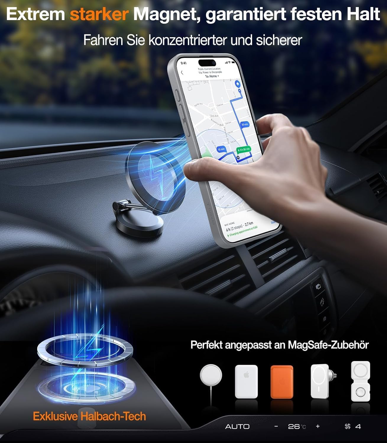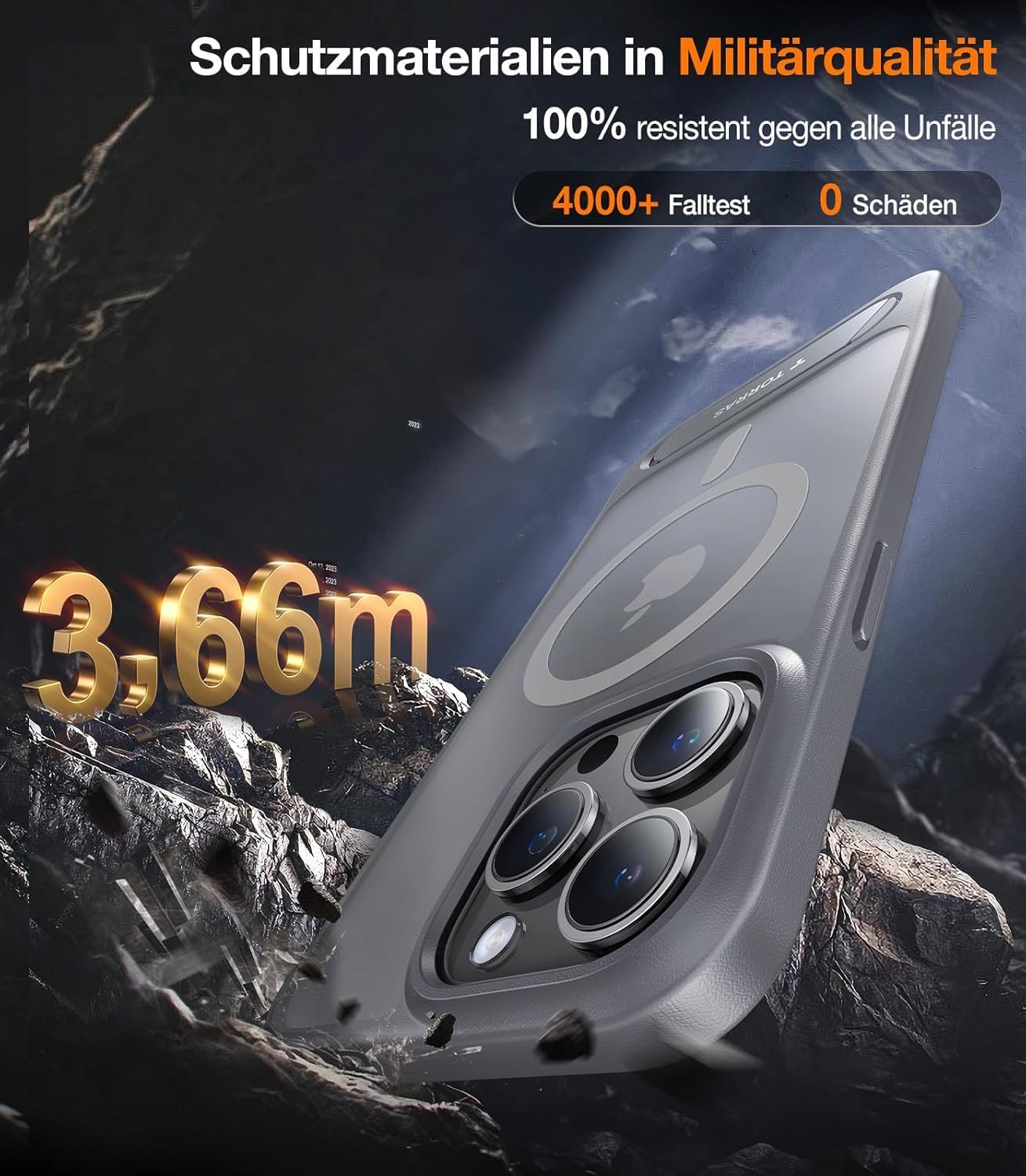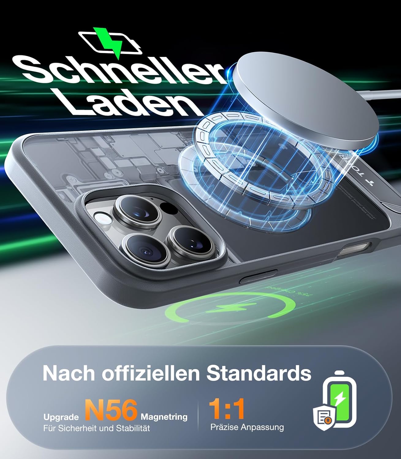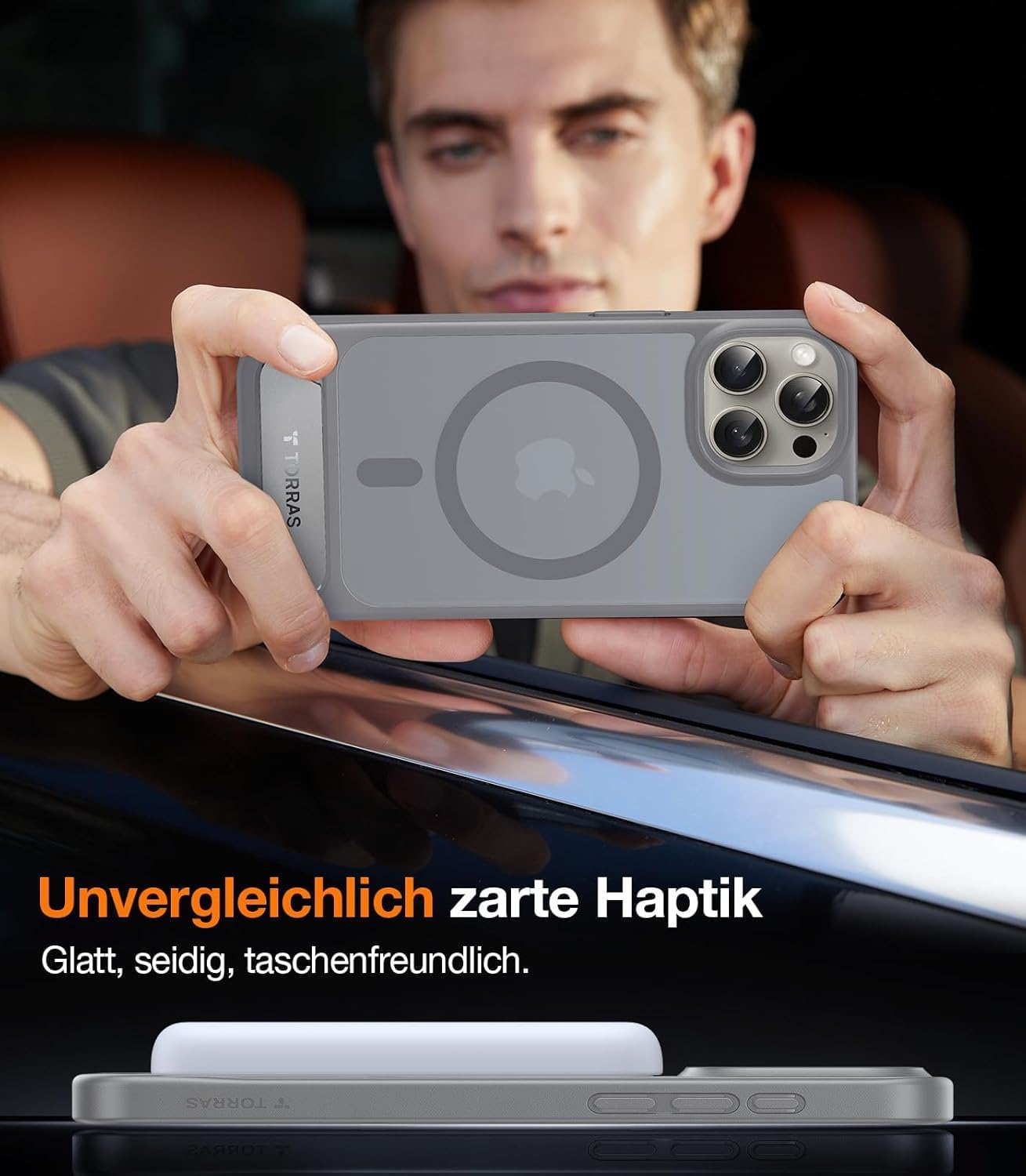• Само магнити? Не - Магнитен с пълна функционалност. Дизайнът на магнитния пръстен пасва 1:1 на оригиналния магнитен пръстен на iPhone и е оборудван с патентованата система от магнити TORRAS Halbach, както и със силни магнити N52. Така че калъфът за мобилен телефон за iPhone 17 Pro се залепва здраво към оригинални магнитни аксесоари като държачи за кола, външни батерии или зарядни устройства, здраво задържащ, щадящ батерията. Бързо зареждане: Няма проблем - стабилно прилягане, без забавяне.