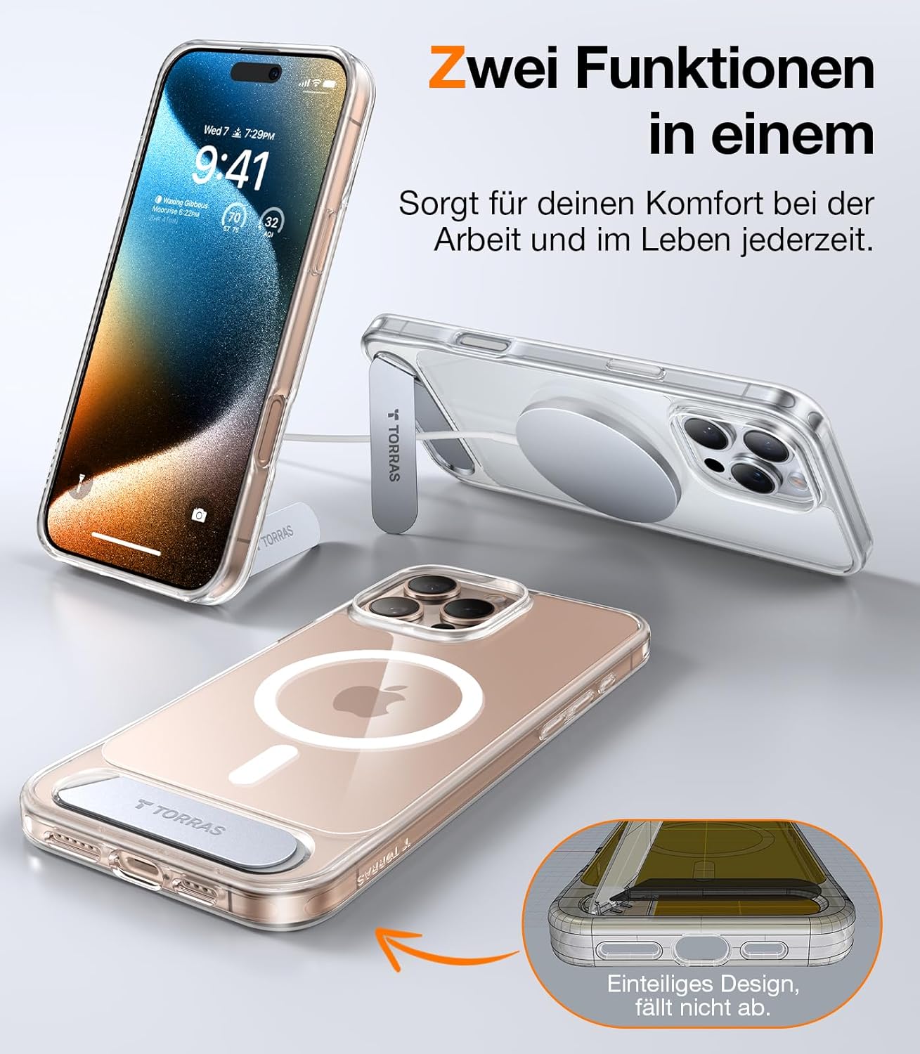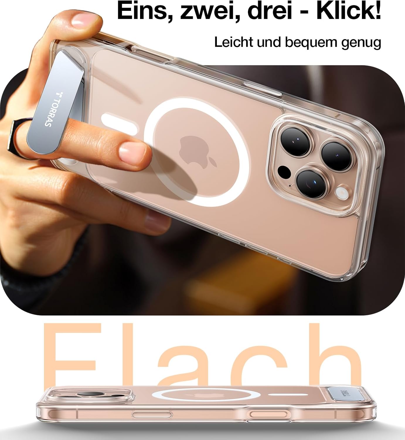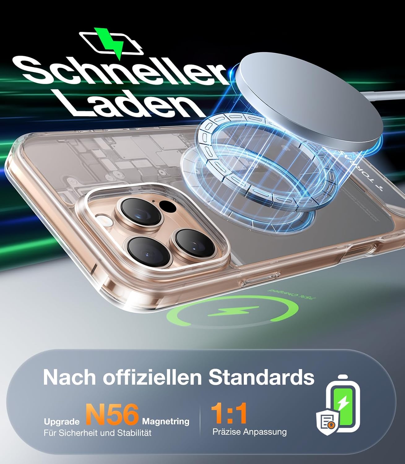 • Само магнити? Не - Магнитен с пълна функционалност. Дизайнът на магнитния пръстен пасва 1:1 на оригиналния магнитен пръстен на iPhone и е оборудван с патентованата система от магнити TORRAS Halbach, както и със силни магнити N52. Така че калъфът за мобилен телефон за iPhone 17 Pro се залепва здраво към оригинални магнитни аксесоари като държачи за кола, външни батерии или зарядни устройства, здраво задържащ, щадящ батерията. Бързо зареждане: Няма проблем - стабилно прилягане, без забавяне.