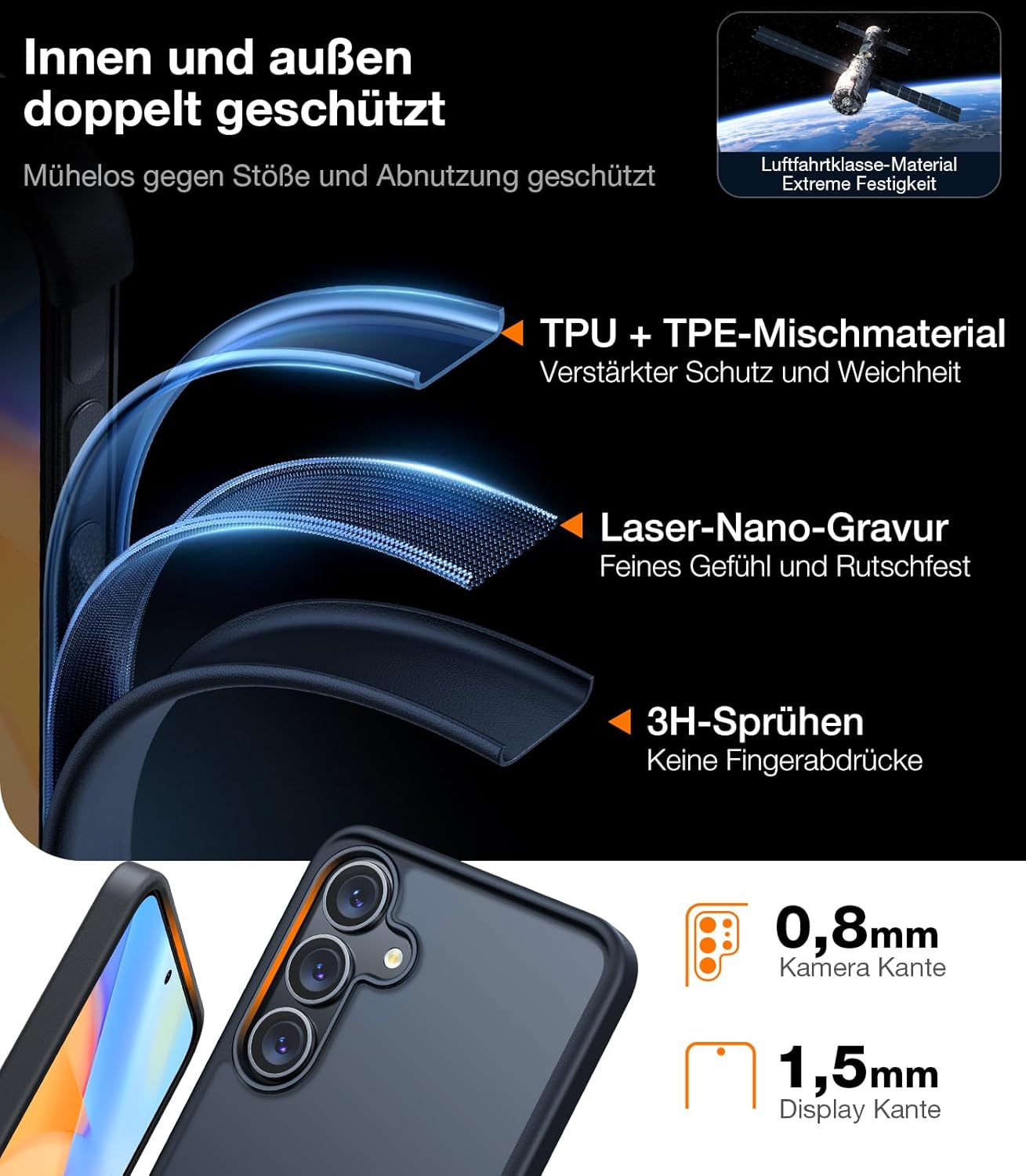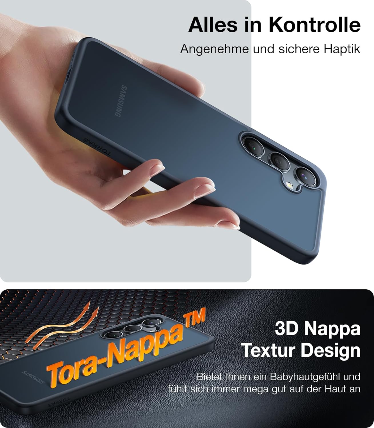 • [Тройна защита, устойчивост на надраскване и удароустойчивост] Калъфът TORRAS Guardian за Samsung S25 Ultra използва комбинация от TPU и TPE материали, допълнени от технология за лазерно гравиране и 3H покритие за подобряване на устойчивостта на надраскване и удароустойчивост. Със специално проектирани защитни ръбове на лещата, повдигнати с 0,8 мм, и повдигнати с 1,5 мм ръбове на дисплея, този калъф за Galaxy S25 Ultra осигурява цялостна защита в ежедневието и ефективно се съпротивлява на всички външни влияния.