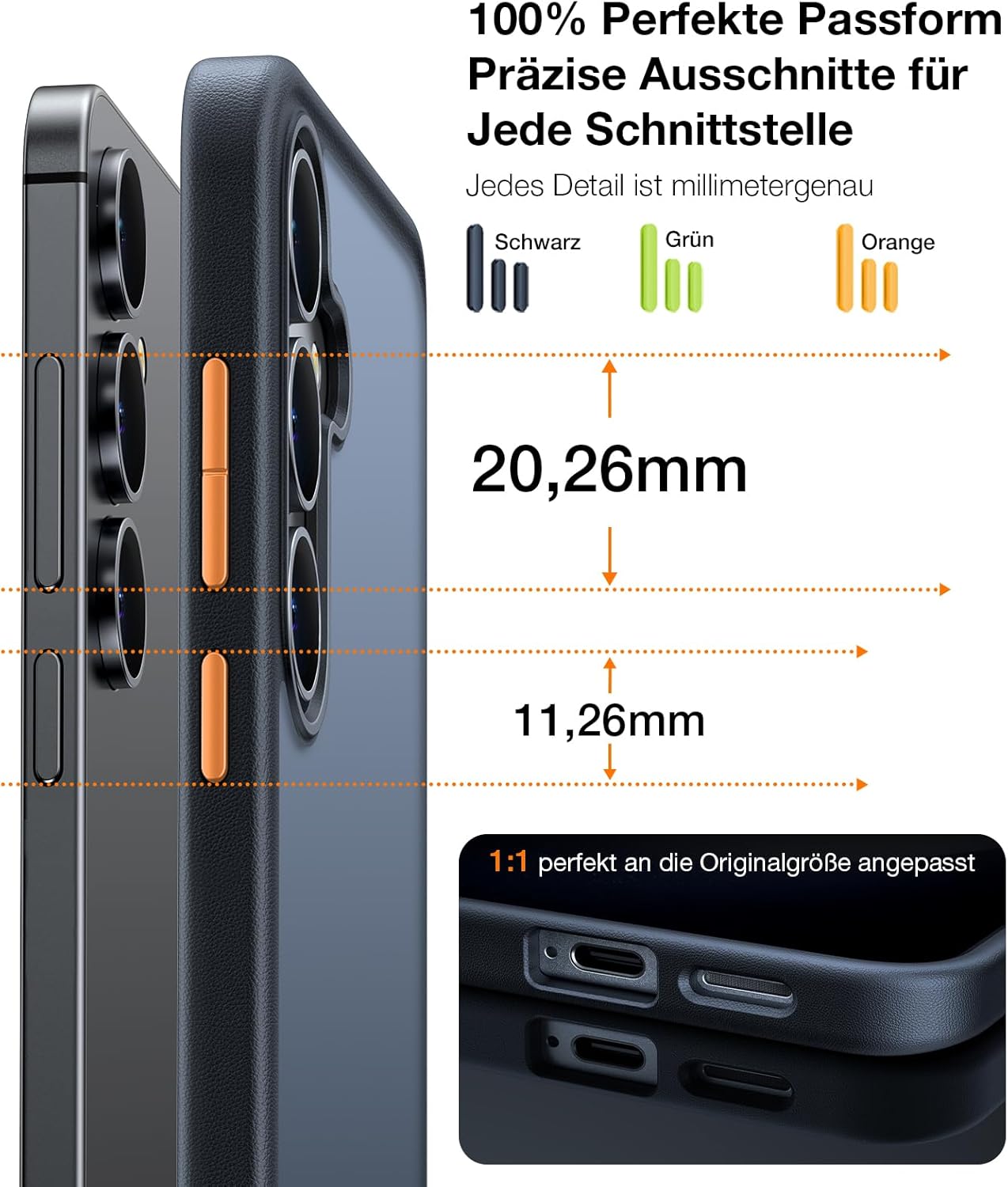 • Луксозно усещане, ексклузивно регулиране: всяко докосване напомня за интериора на луксозен спортен автомобил. Този аксесоар за S25 Ultra е с подобрена 3D напа структура с фино лазерно гравиране за особено деликатен захват. Гърбът е покрит с олеофобно и хидрофобно нано покритие, което предотвратява пръстови отпечатъци и замърсявания и запазва калъфа да изглежда като нов. Това ще защити вашия Samsung Galaxy S25 Ultra със стил и лукс.