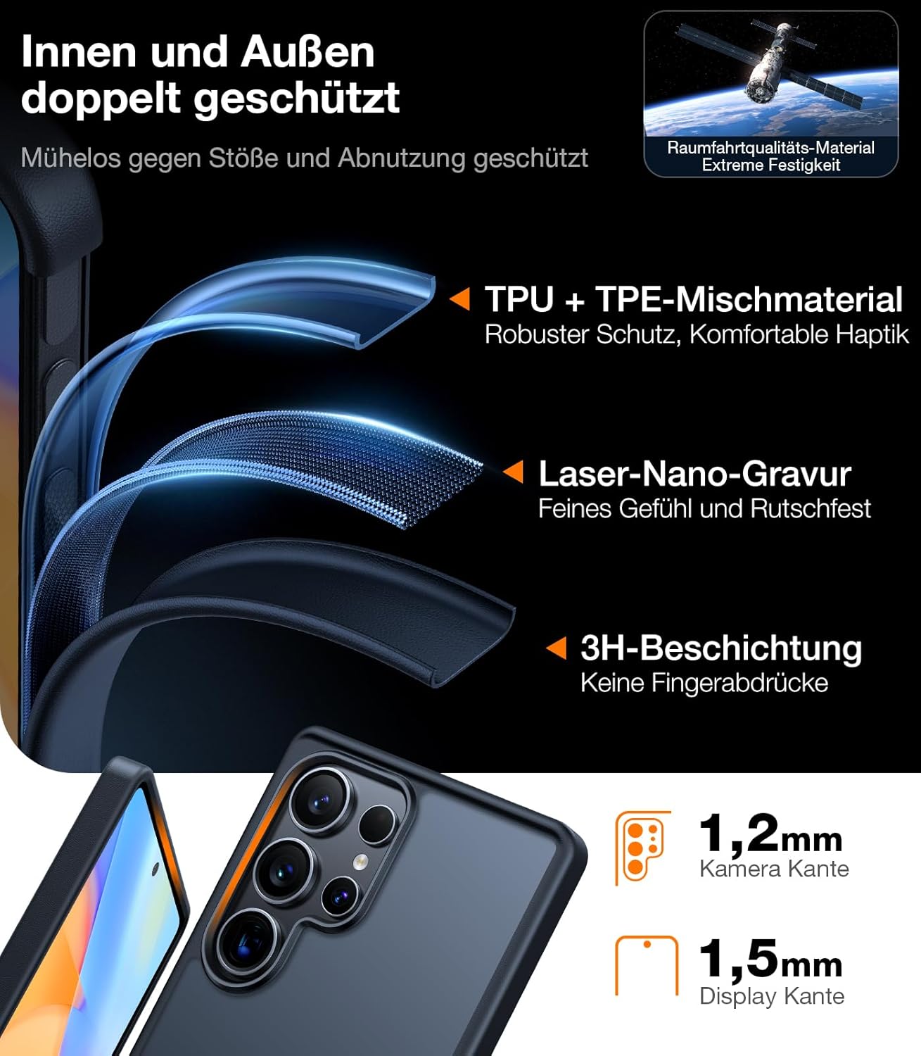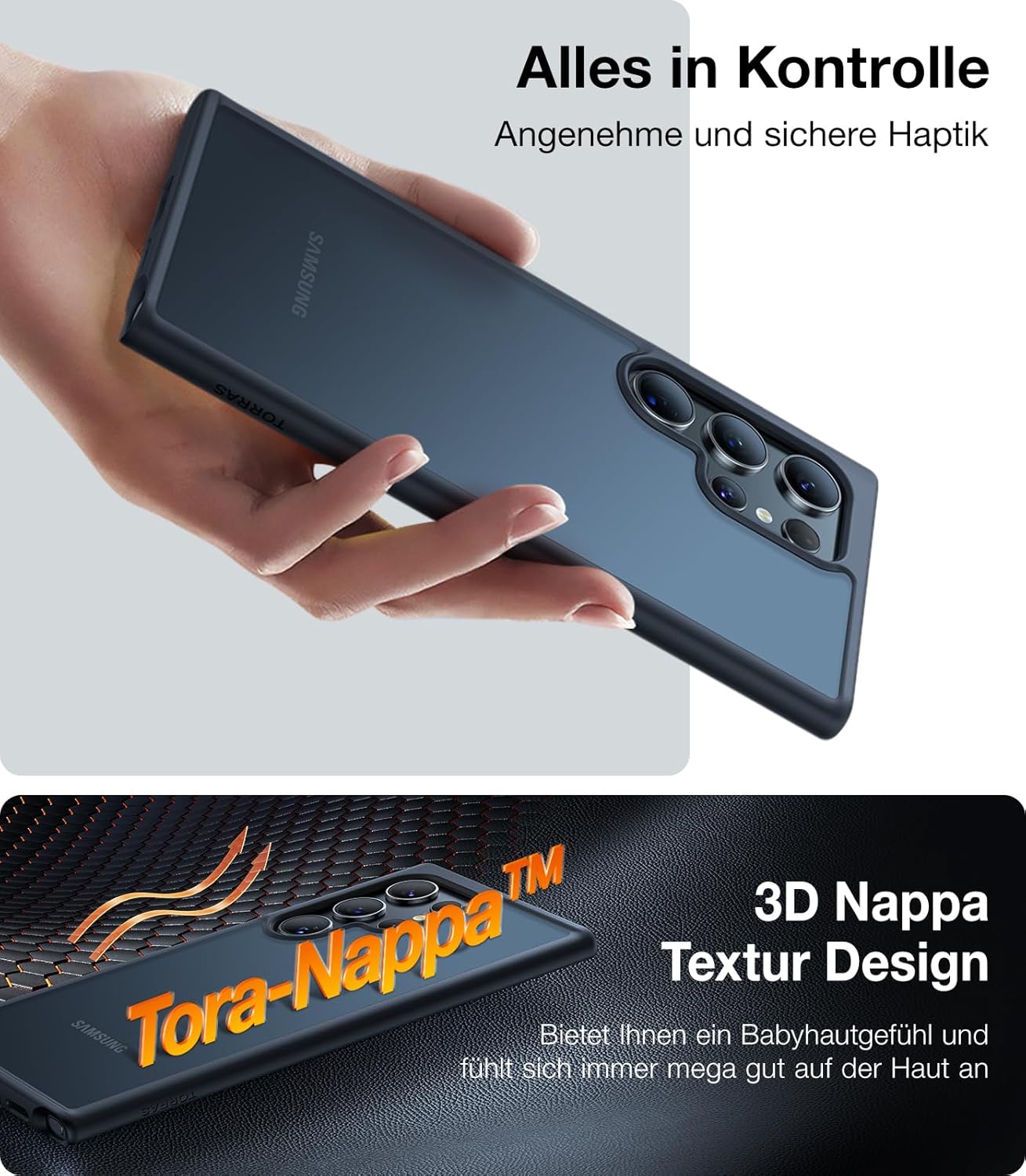 • [Тройна защита, устойчивост на надраскване и удароустойчивост] Калъфът TORRAS Guardian за Samsung S25 Ultra използва комбинация от TPU и TPE материали, допълнени от технология за лазерно гравиране и 3H покритие за подобряване на устойчивостта на надраскване и удароустойчивост. Със специално проектирани защитни ръбове на лещата, повдигнати с 0,8 мм, и повдигнати с 1,5 мм ръбове на дисплея, този калъф за Galaxy S25 Ultra осигурява цялостна защита в ежедневието и ефективно се съпротивлява на всички външни влияния.