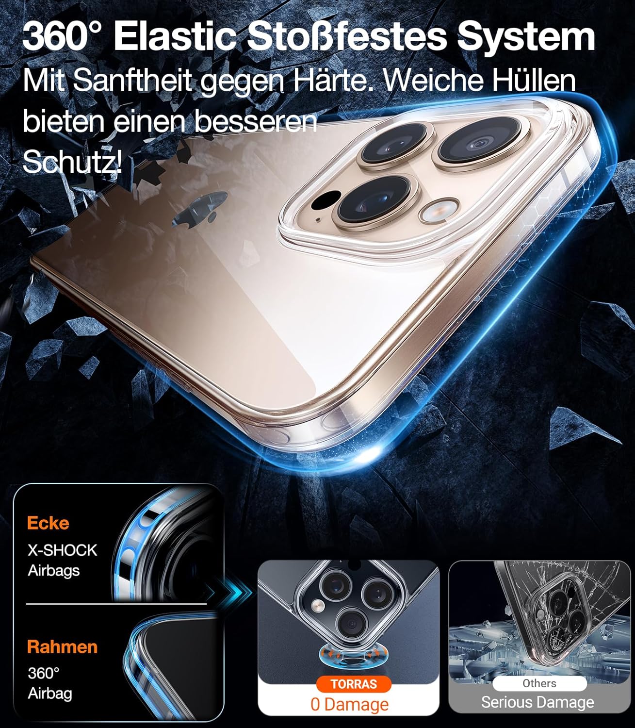 • 360° цялостна защита. Цялостна защита на всички важни детайли. Технологията X-SHOCK 3.0 осигурява особено силна защита за ъгли и ръбове. В същото време, издатината с височина 1,5 мм на екрана и камерата предпазва вашия iPhone от надрасквания и повреди. Тази внимателна грижа прави вашия iPhone 16 Pro уникален.