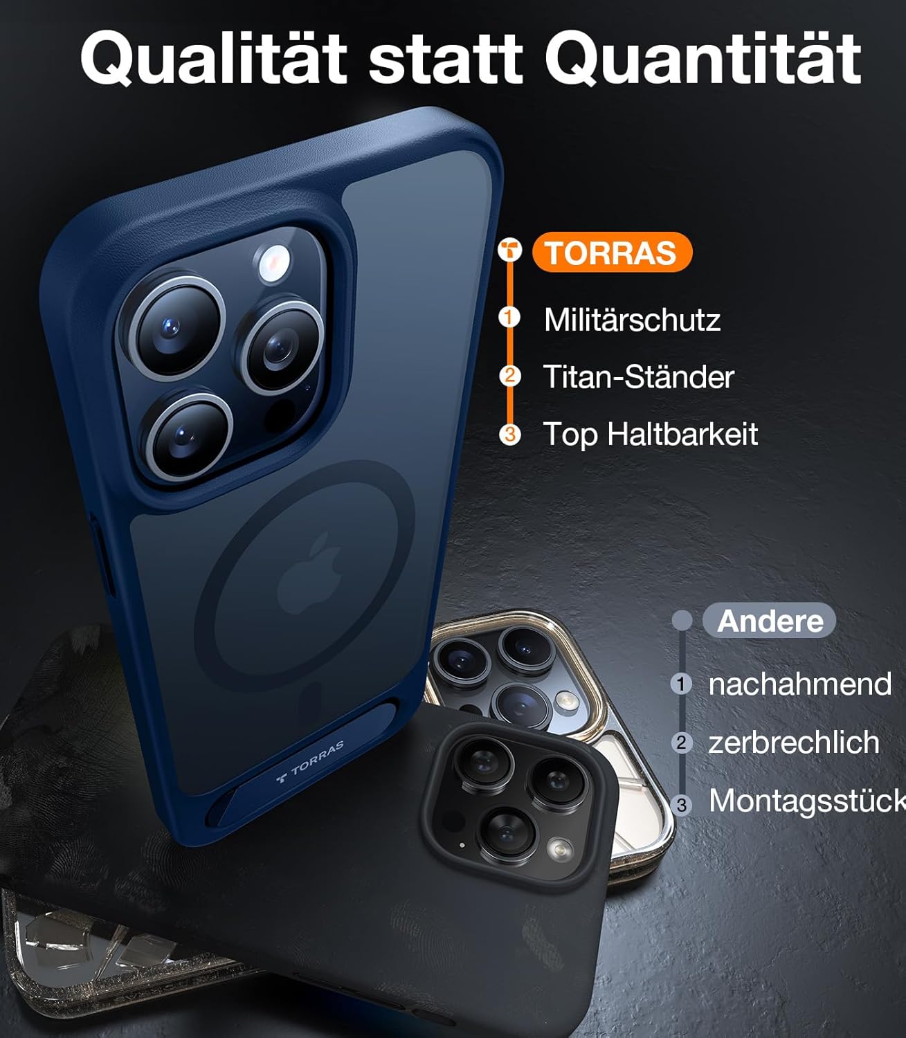 • Само магнити? Не - Магнитен с пълна функционалност. Дизайнът на магнитния пръстен пасва 1:1 на оригиналния магнитен пръстен на iPhone и е оборудван с патентованата система от магнити TORRAS Halbach, както и със силни магнити N52. Така че калъфът за мобилен телефон за iPhone 17 Pro се залепва здраво към оригинални магнитни аксесоари като държачи за кола, външни батерии или зарядни устройства, здраво задържащ, щадящ батерията. Бързо зареждане: Няма проблем - стабилно прилягане, без забавяне.
