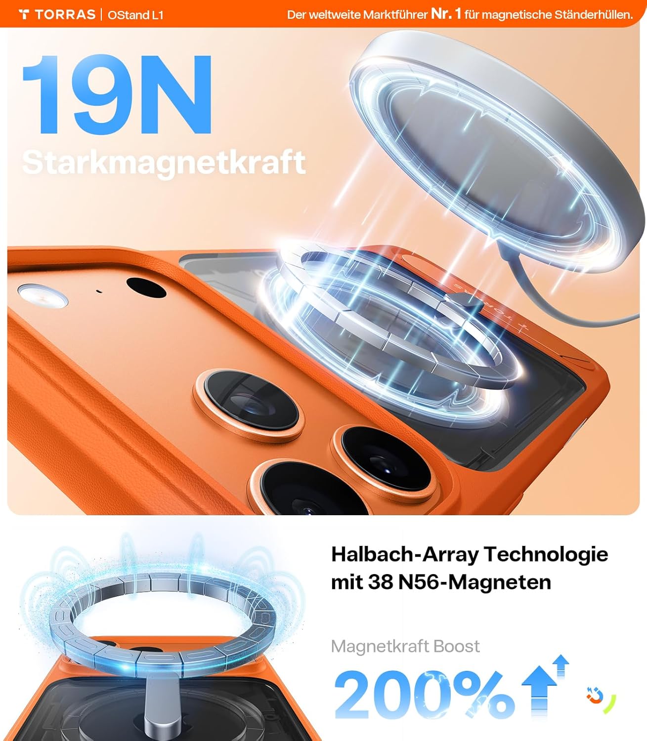 • Само магнити? Не - Магнитен с пълна функционалност. Дизайнът на магнитния пръстен пасва 1:1 на оригиналния магнитен пръстен на iPhone и е оборудван с патентованата система от магнити TORRAS Halbach, както и със силни магнити N52. Така че калъфът за мобилен телефон за iPhone 17 Pro се залепва здраво към оригинални магнитни аксесоари като държачи за кола, външни батерии или зарядни устройства, здраво задържащ, щадящ батерията. Бързо зареждане: Няма проблем - стабилно прилягане, без забавяне.