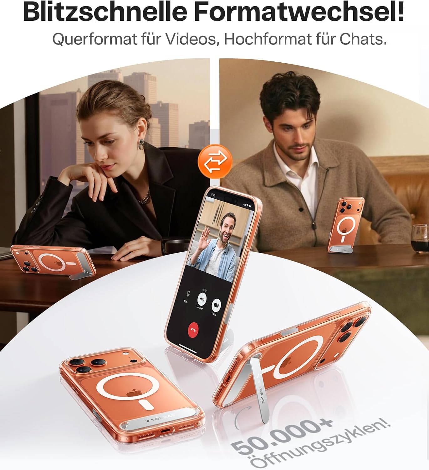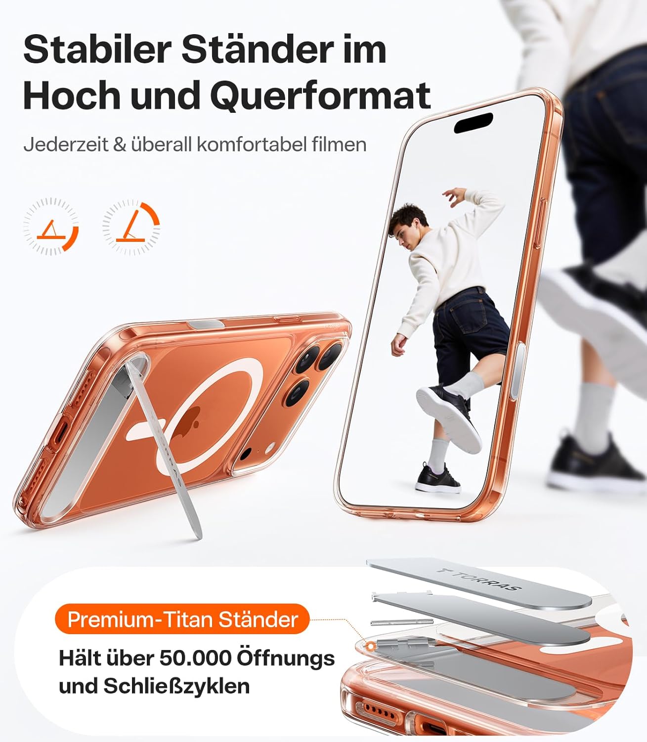 • Функция на стойката: Фино скрита, супер практична. Калъфът за iPhone 17 Pro има вградена стойка от титаниева сплав, стабилна и издръжлива. Независимо дали гледате маратон от сериали, участвате във видео среща или четете: стойката освобождава ръцете ви в ежедневието. Просто разгънете, поставете сигурно и се концентрирайте върху най-важното, без да държите.