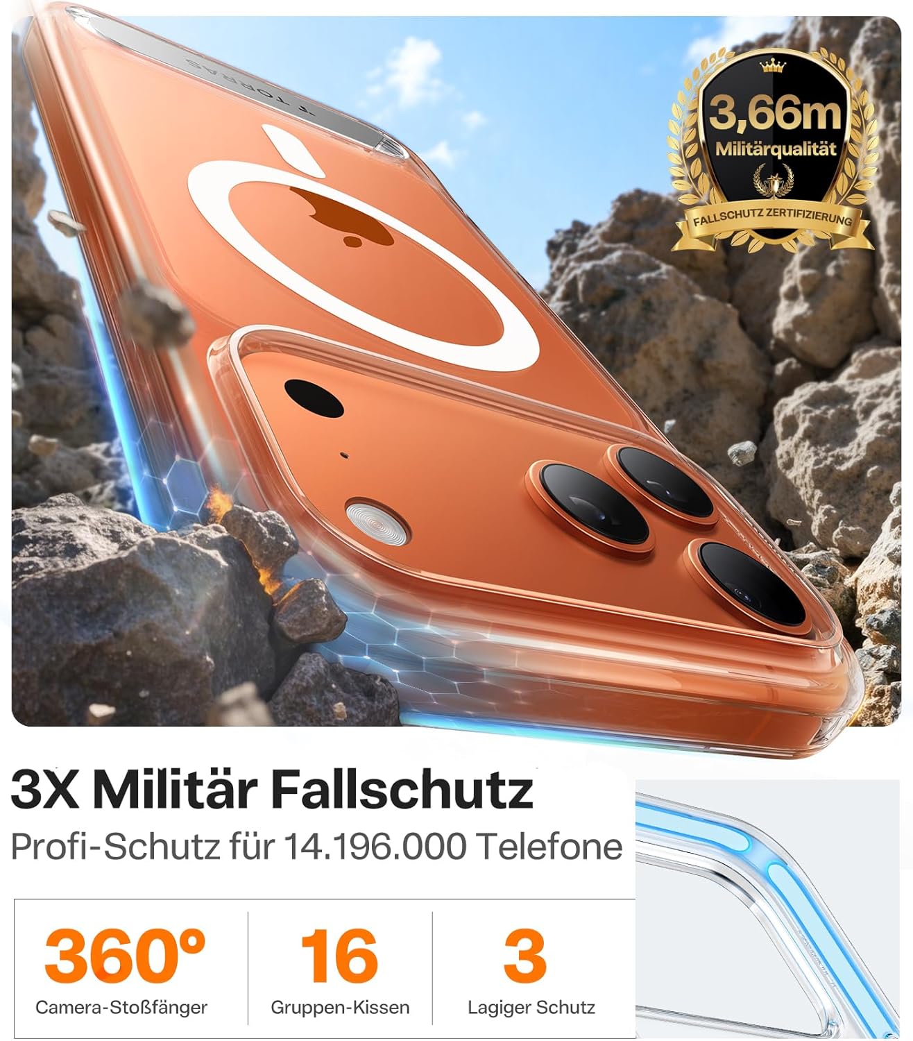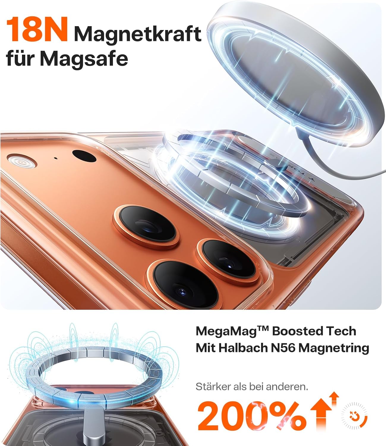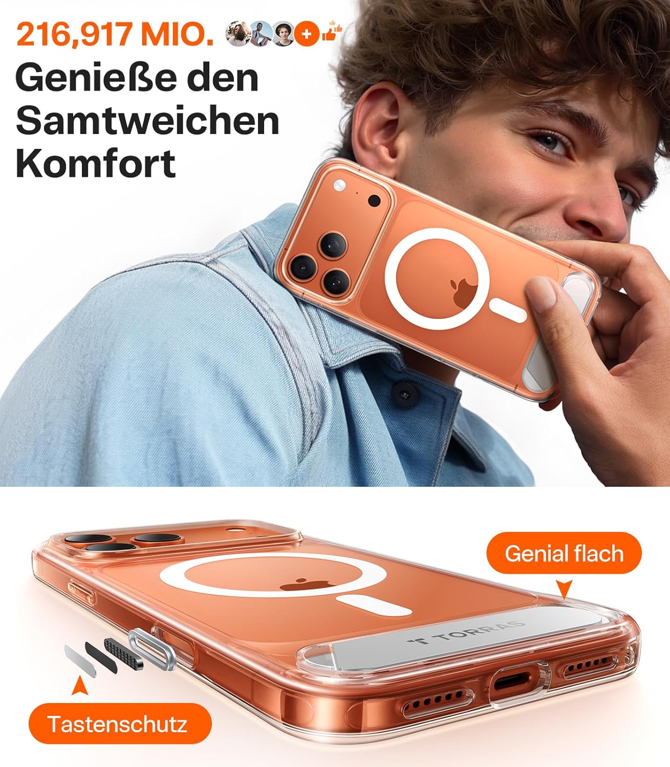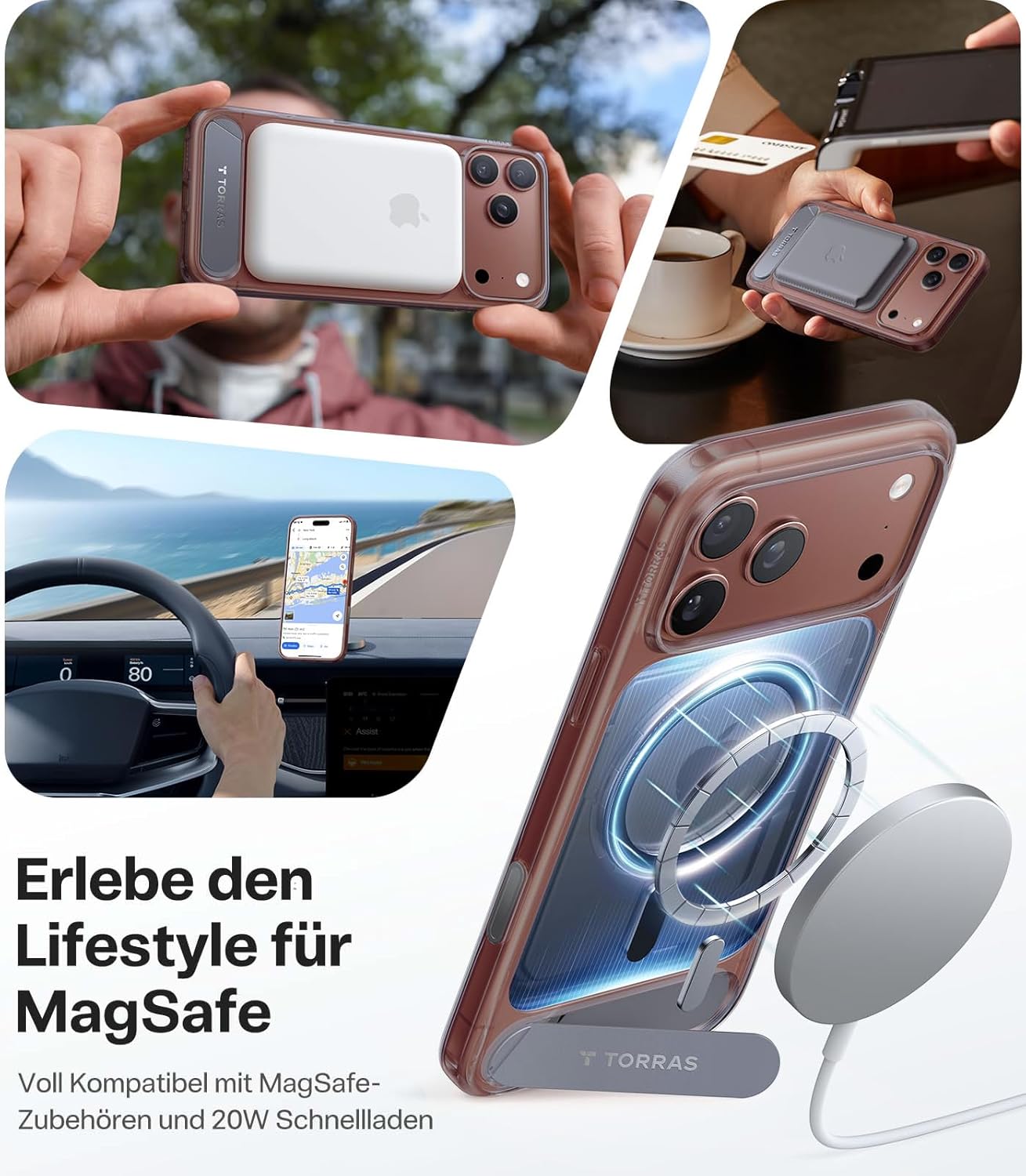• Само магнити? Не - Магнитен с пълна функционалност. Дизайнът на магнитния пръстен пасва 1:1 на оригиналния магнитен пръстен на iPhone и е оборудван с патентованата система от магнити TORRAS Halbach, както и със силни магнити N52. Така че калъфът за мобилен телефон за iPhone 17 Pro се залепва здраво към оригинални магнитни аксесоари като държачи за кола, външни батерии или зарядни устройства, здраво задържащ, щадящ батерията. Бързо зареждане: Няма проблем - стабилно прилягане, без забавяне.