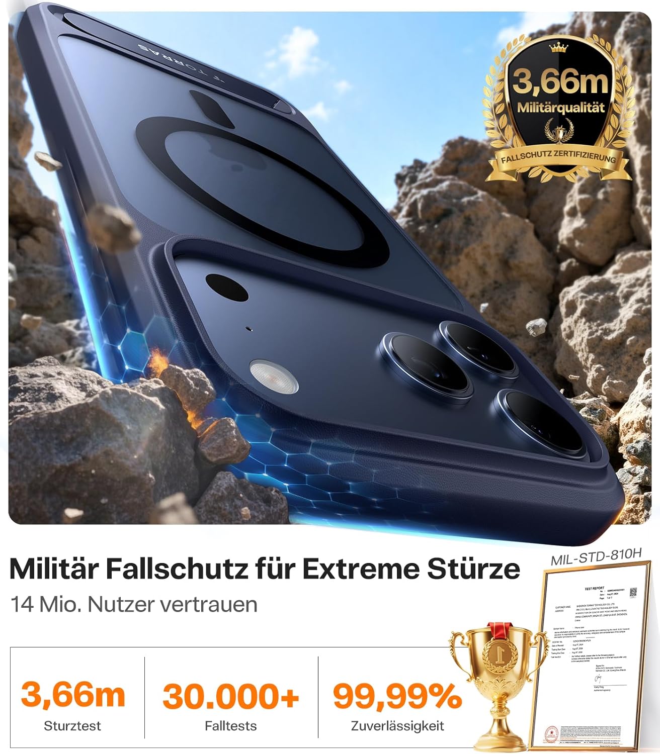 • Устойчив на падане? Дори по-добре, отколкото си мислите. Този калъф за iPhone 17 Pro има многослойна структура за абсорбиране на удари: Вътрешен мек TPU материал за абсорбиране на удара, отвън устойчив на надраскване PC гръб. Патентованата технология TORRAS 3D ShockMAT е интегрирана в четирите ъгъла - доказано е устойчива на удар от височина на падане от 3,66 метра. Това осигурява на вашия iPhone цялостна защита - без слаби места.