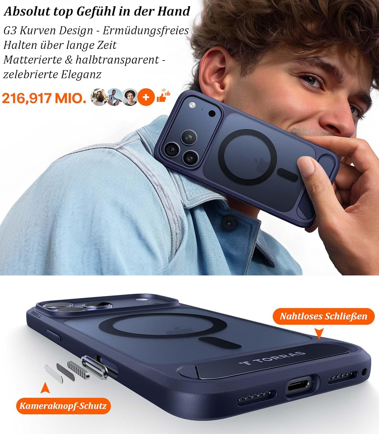 • Само магнити? Не - Магнитен с пълна функционалност. Дизайнът на магнитния пръстен пасва 1:1 на оригиналния магнитен пръстен на iPhone и е оборудван с патентованата система от магнити TORRAS Halbach, както и със силни магнити N52. Така че калъфът за мобилен телефон за iPhone 17 Pro се залепва здраво към оригинални магнитни аксесоари като държачи за кола, външни батерии или зарядни устройства, здраво задържащ, щадящ батерията. Бързо зареждане: Няма проблем - стабилно прилягане, без забавяне.