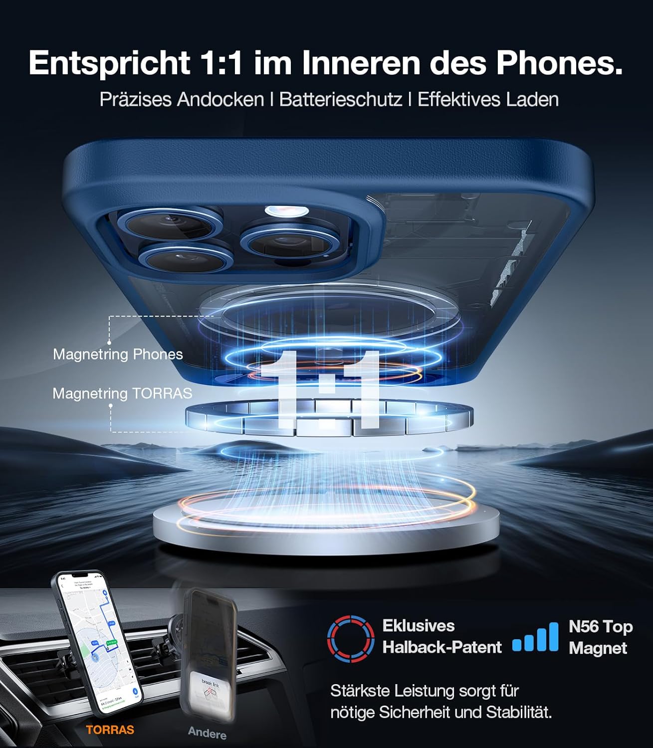 • Само магнити? Не - Магнитен с пълна функционалност. Дизайнът на магнитния пръстен пасва 1:1 на оригиналния магнитен пръстен на iPhone и е оборудван с патентованата система от магнити TORRAS Halbach, както и със силни магнити N52. Така че калъфът за мобилен телефон за iPhone 17 Pro се залепва здраво към оригинални магнитни аксесоари като държачи за кола, външни батерии или зарядни устройства, здраво задържащ, щадящ батерията. Бързо зареждане: Няма проблем - стабилно прилягане, без забавяне.
