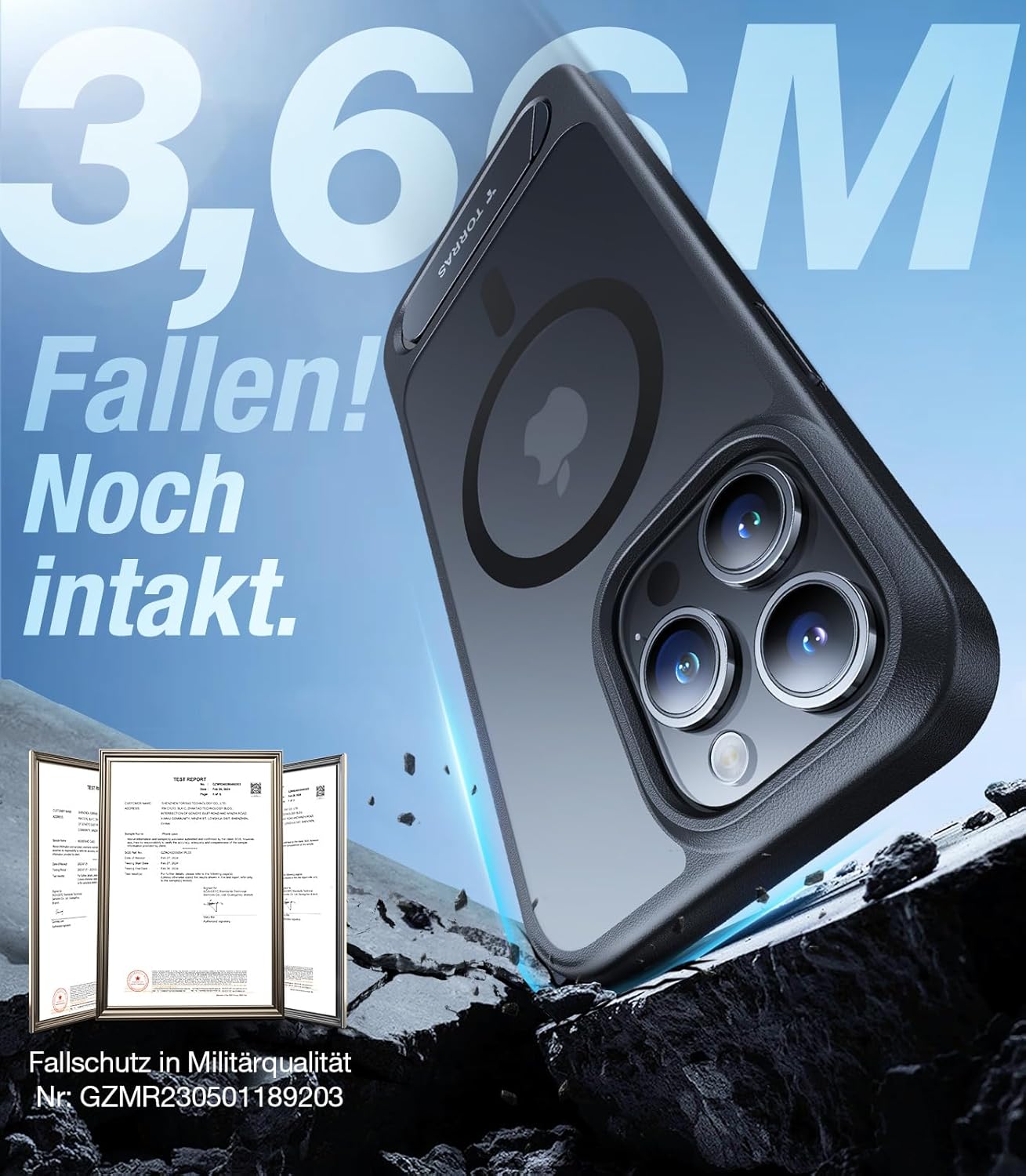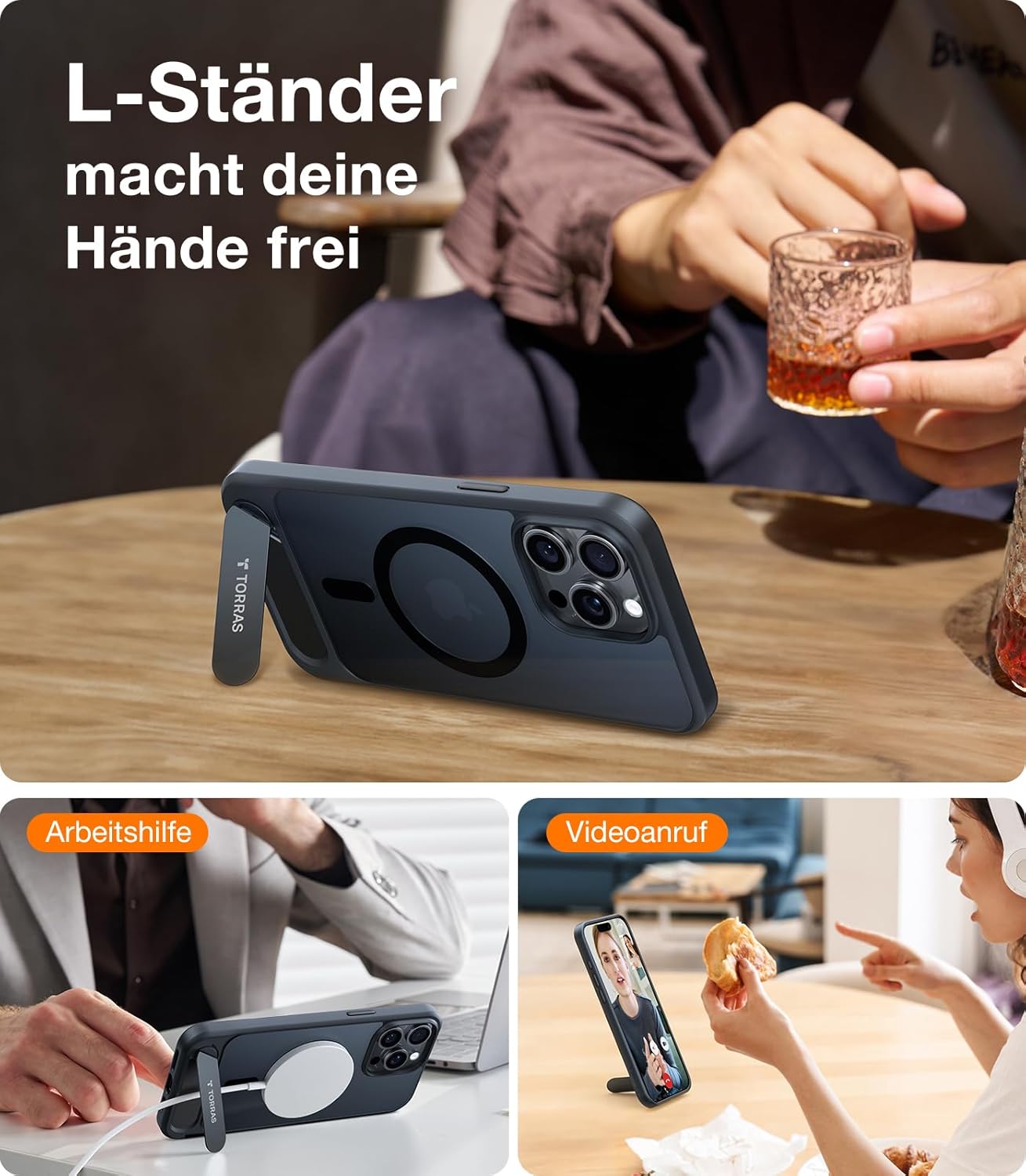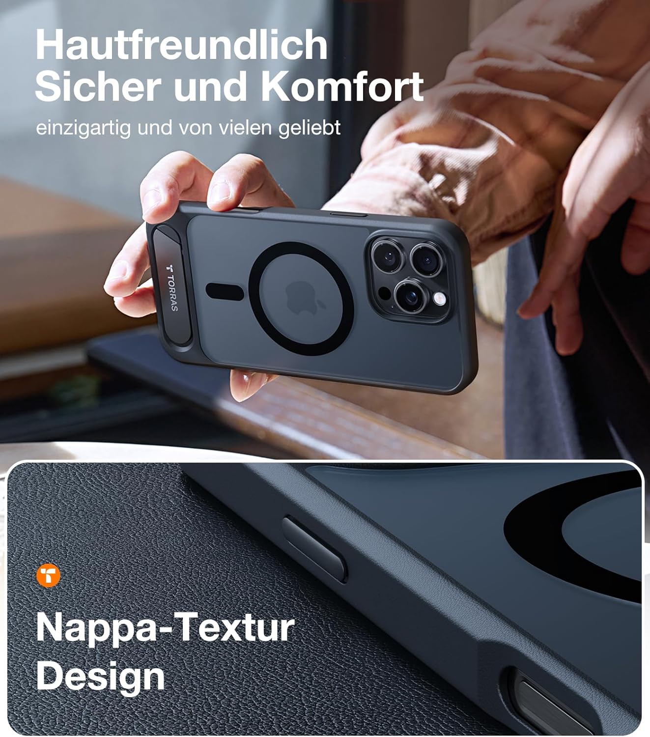 • Само магнити? Не - Магнитен с пълна функционалност. Дизайнът на магнитния пръстен пасва 1:1 на оригиналния магнитен пръстен на iPhone и е оборудван с патентованата система от магнити TORRAS Halbach, както и със силни магнити N52. Така че калъфът за мобилен телефон за iPhone 17 Pro се залепва здраво към оригинални магнитни аксесоари като държачи за кола, външни батерии или зарядни устройства, здраво задържащ, щадящ батерията. Бързо зареждане: Няма проблем - стабилно прилягане, без забавяне.