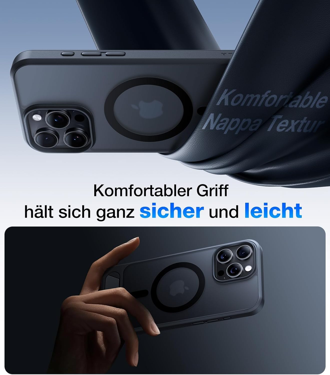 • Функция на стойката: Фино скрита, супер практична. Калъфът за iPhone 17 Pro има вградена стойка от титаниева сплав, стабилна и издръжлива. Независимо дали гледате маратон от сериали, участвате във видео среща или четете: стойката освобождава ръцете ви в ежедневието. Просто разгънете, поставете сигурно и се концентрирайте върху най-важното, без да държите.